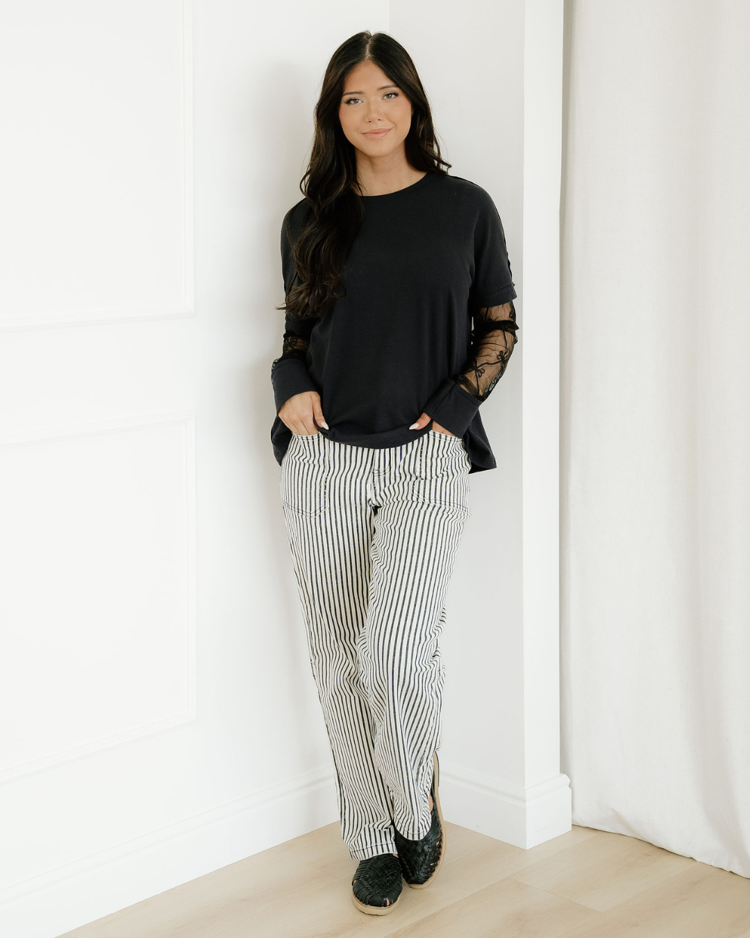 Striped print detail adds a trendy touch to classic shift jeans.