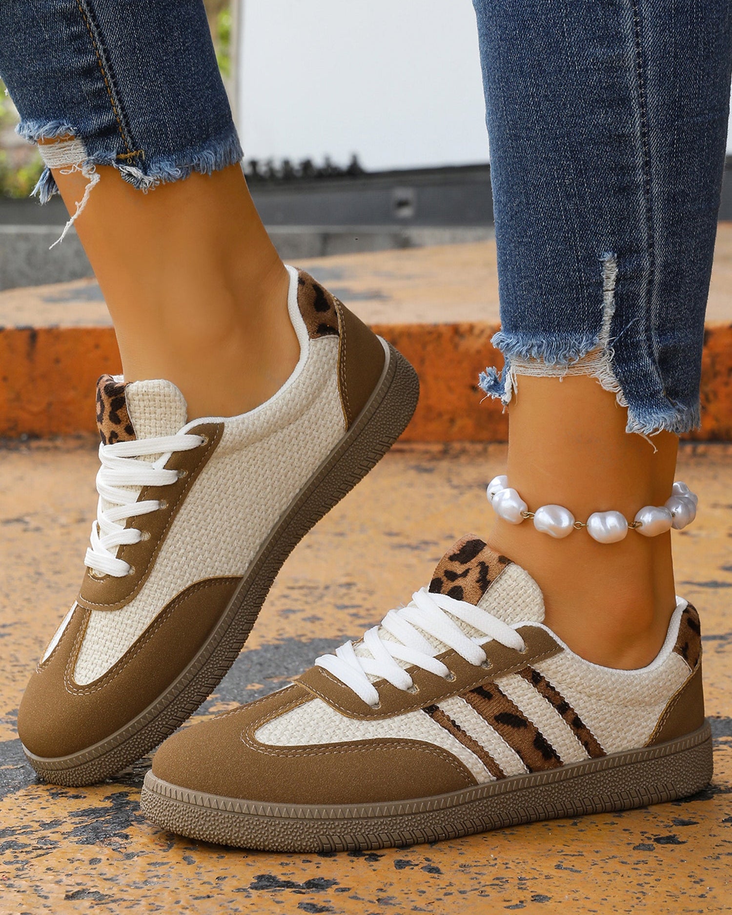 Coffee Color Block Leopard Patchwork Lace-up Sneaker