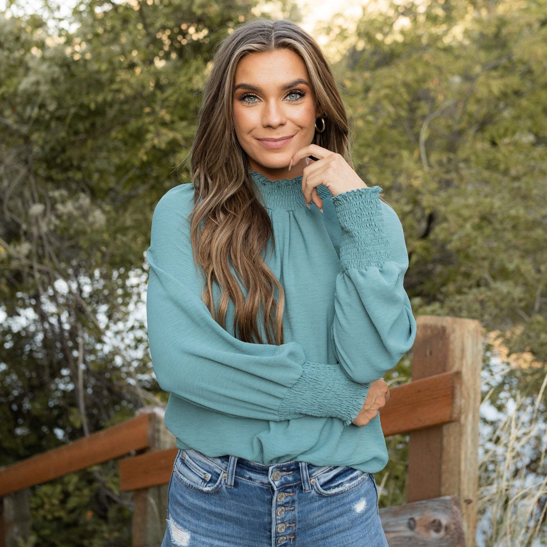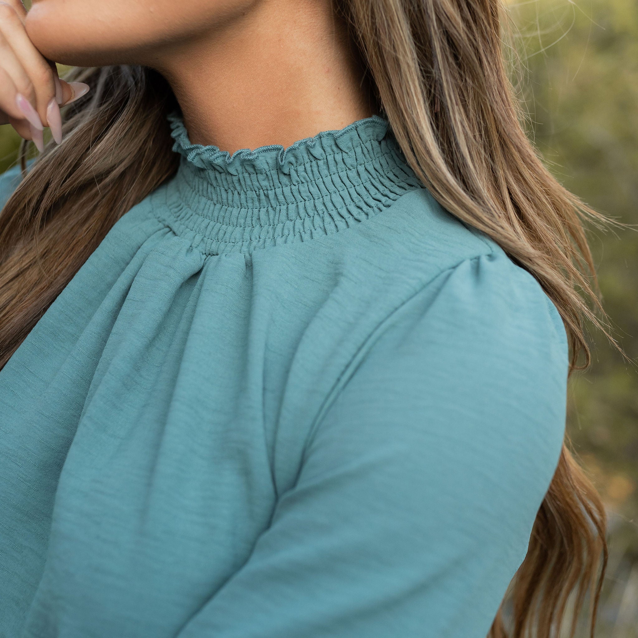The details on our Cora Blouse are out of this world! The high neck and sleeve have adorable rushing. This one is perfect for those days that you want to feel a little more comfortable or dress up for a night on the town.