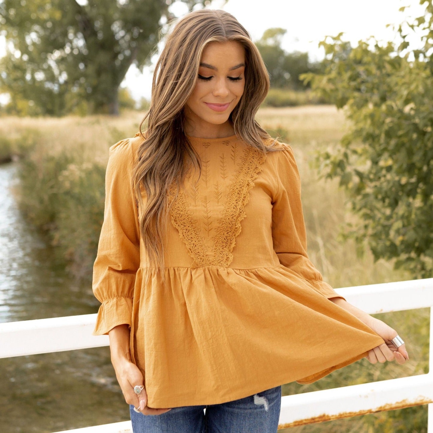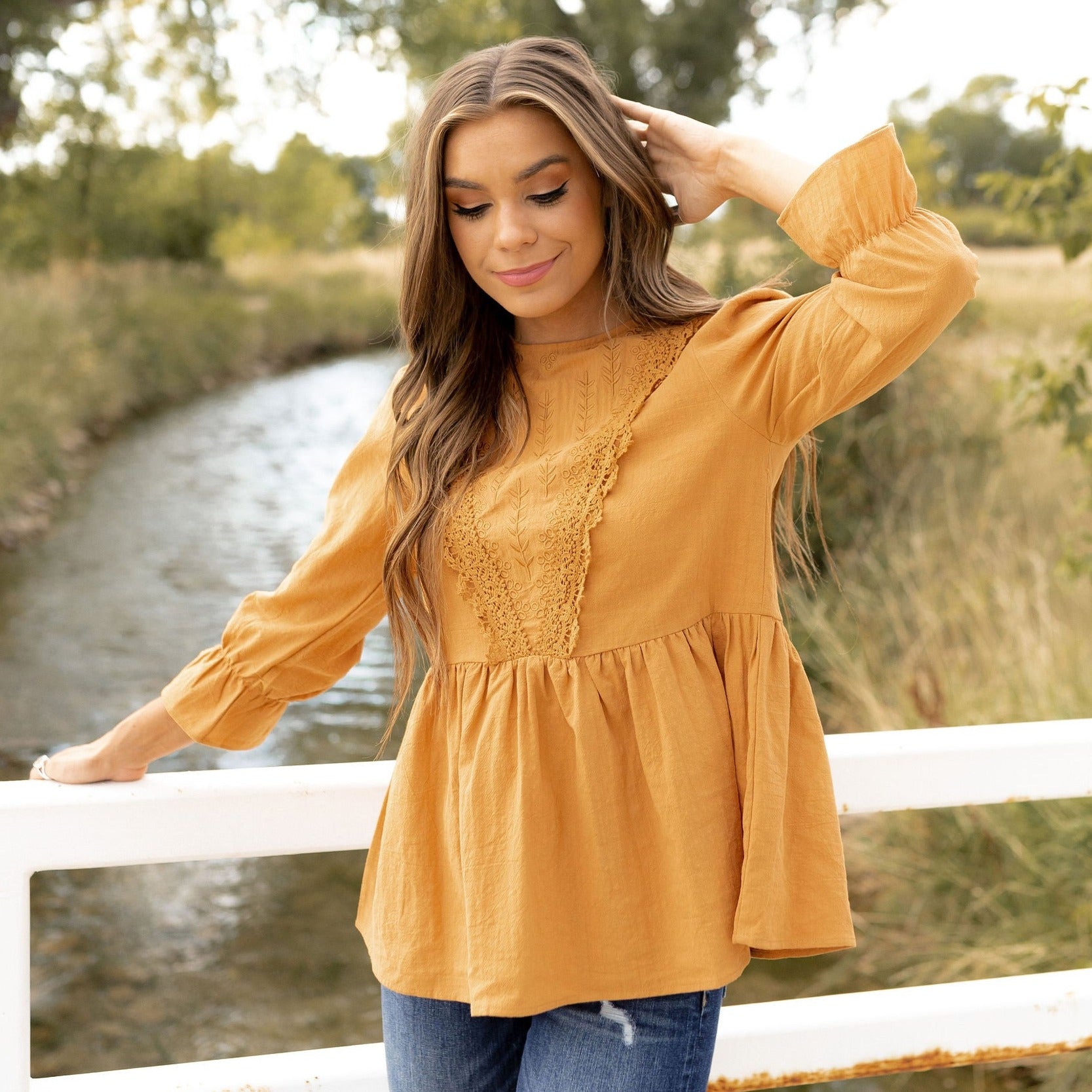 Upgrade your wardrobe with the Eloise Blouse featuring an adorable peplum hem and delicate lace detail. Perfect for any occasion, this blouse will quickly become your go-to piece for a chic and stylish look. Don't miss out on this wardrobe essential!