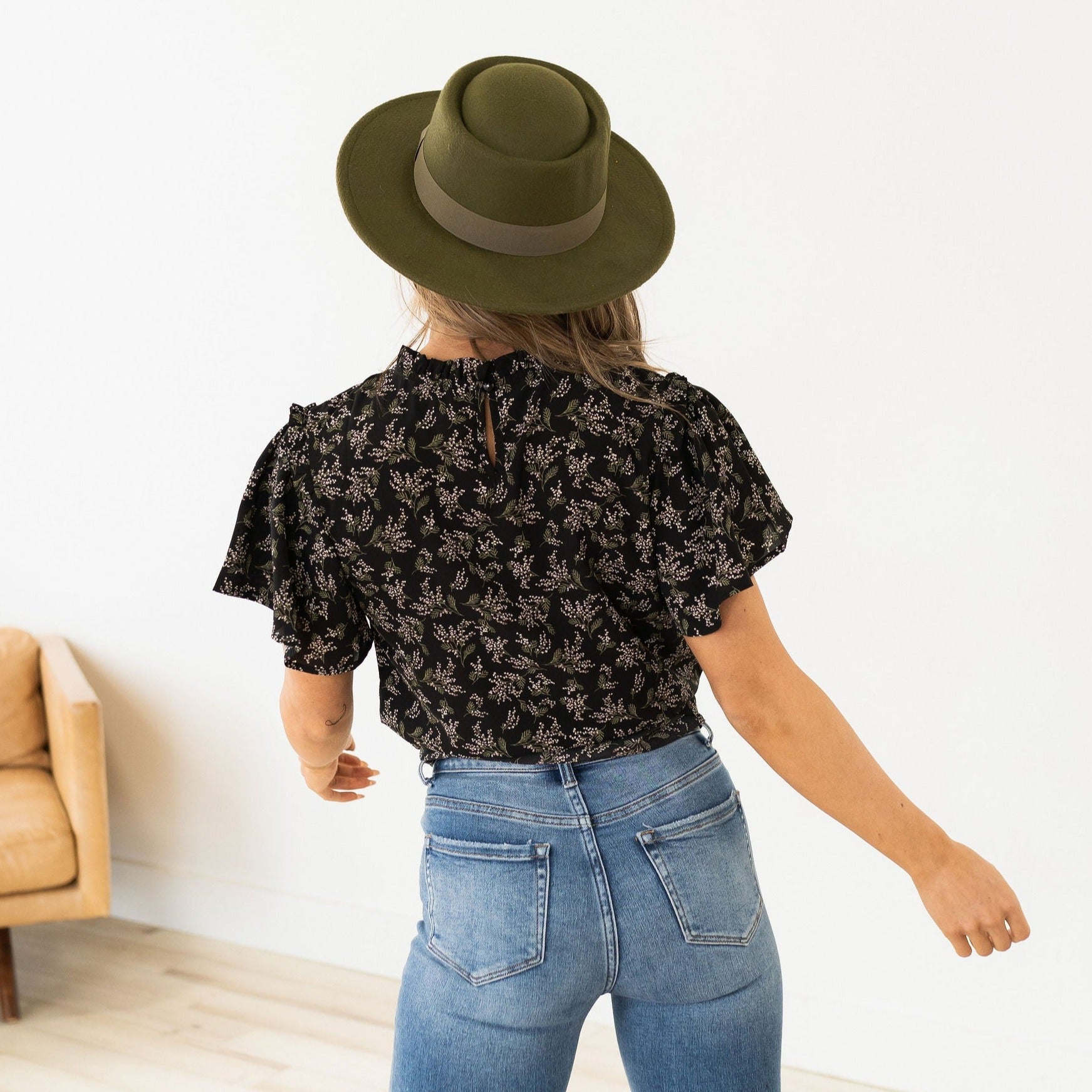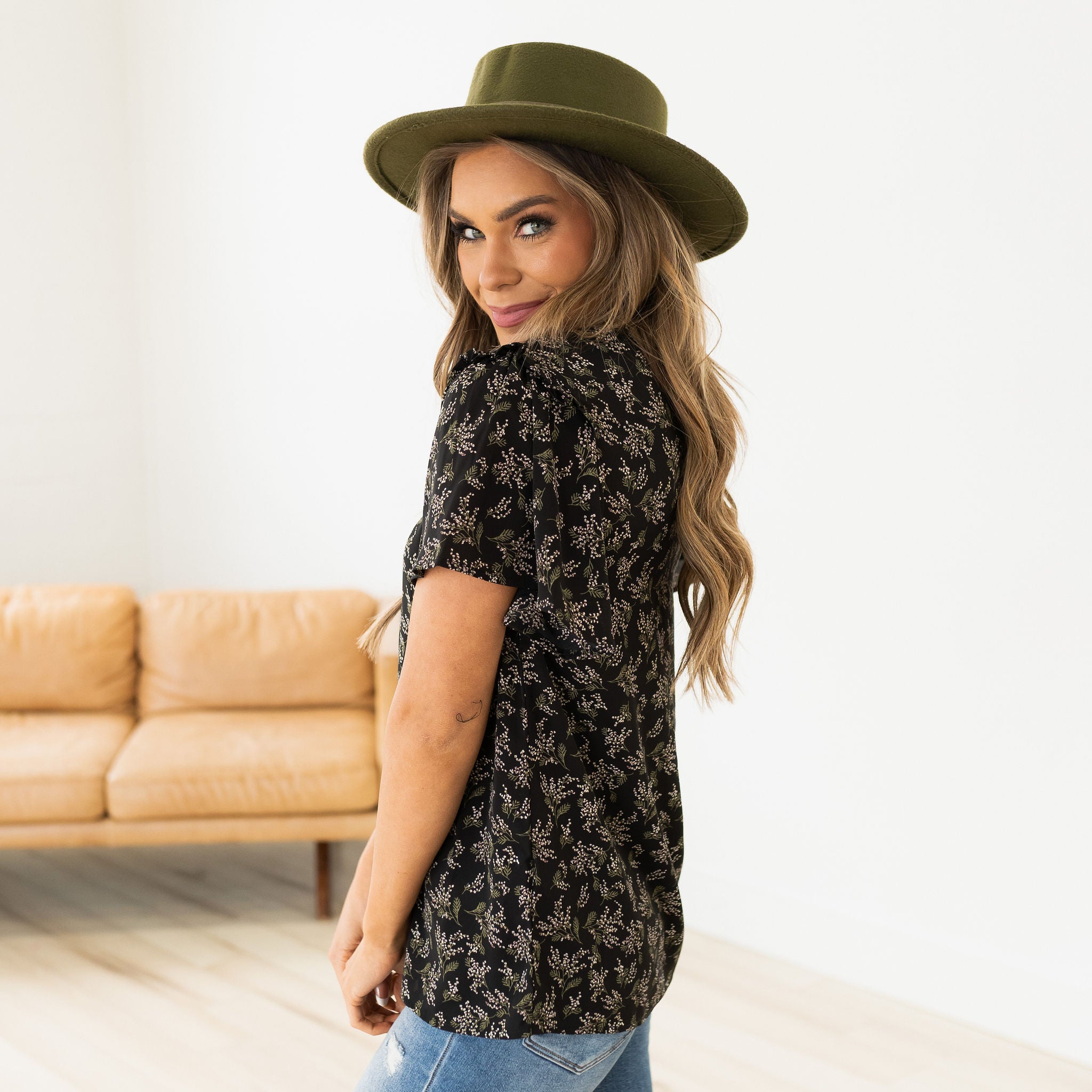 Our Gianna Blouse is such a beautiful piece! It has delicate fall florals on it that will dress up any outfit! The flowy sleeves and ruffled neckline add the perfect touch to this blouse!