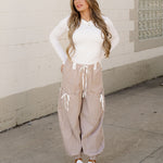 - Featuring a unique knot detail at the waist, these pants offer a trendy twist to wardrobe essentials.