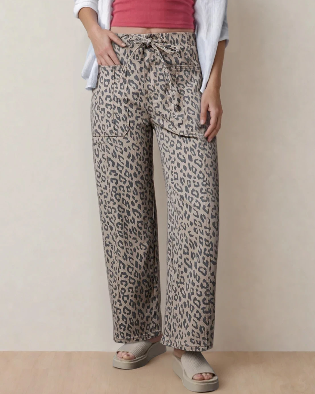 PREORDER Athena Leopard Print Drawstring Waist Pocketed Wide Leg Jeans | Dropship