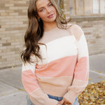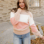 • This color block sweater pairs well with solid pants and skirts.