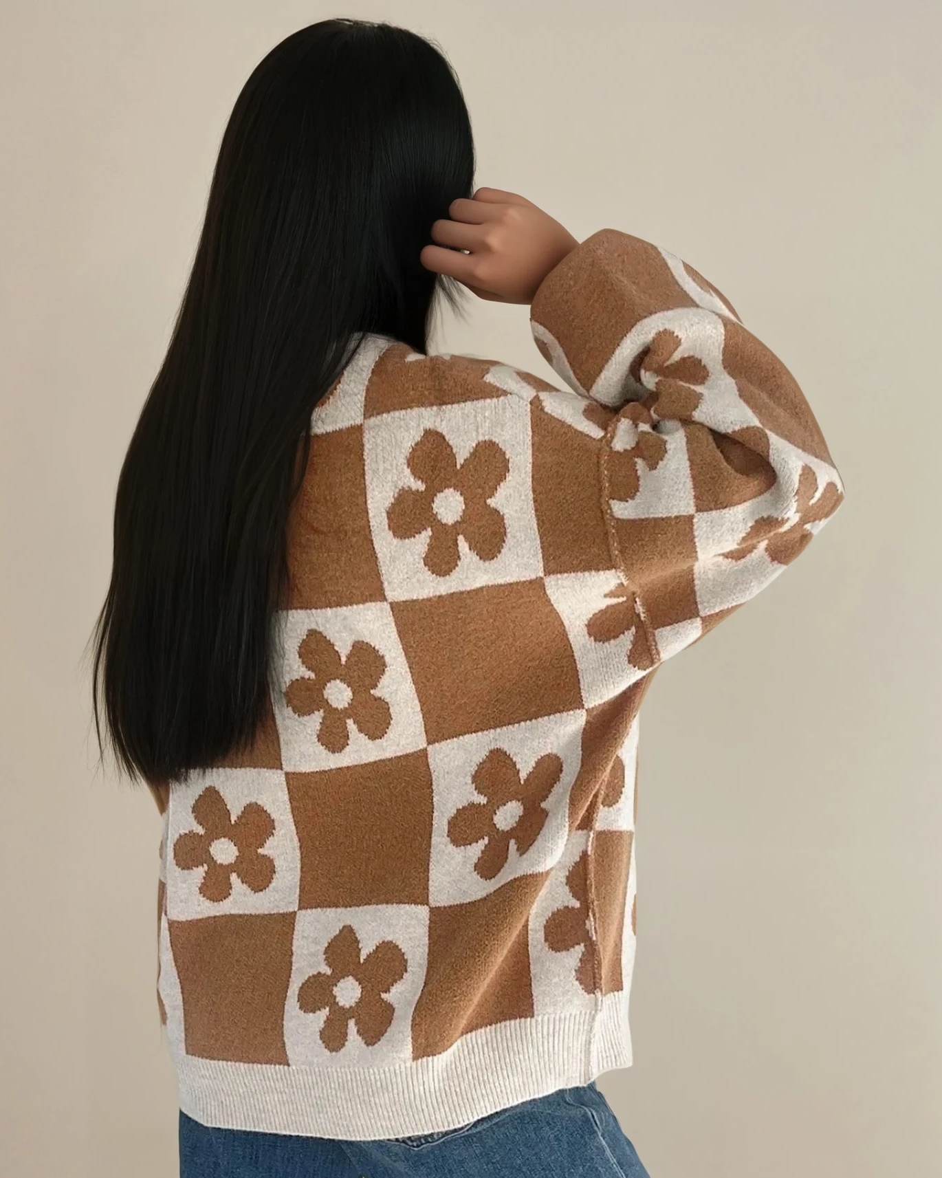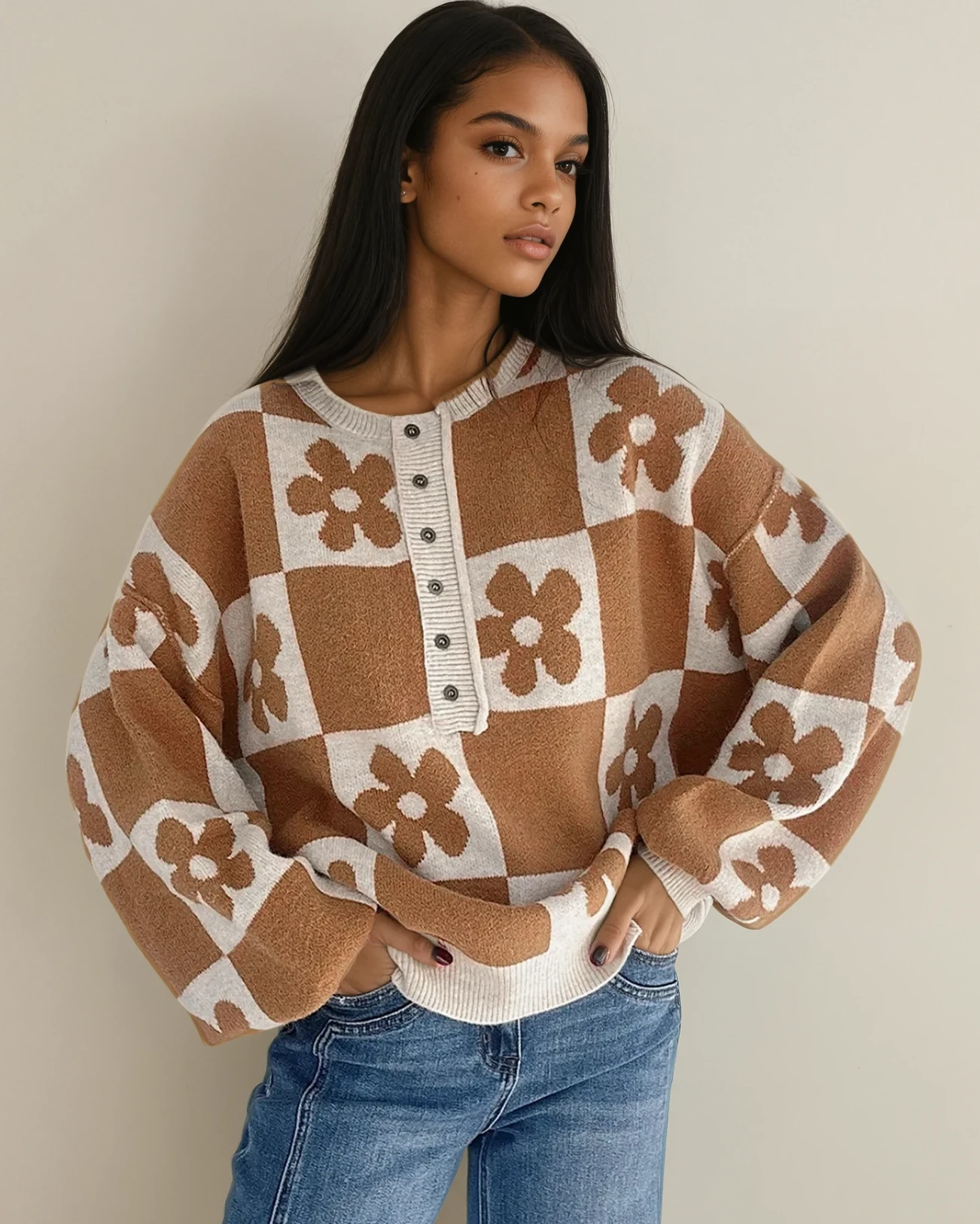 • Embrace the charm of the Flower Colorblock Checkered Henley Sweater, featuring a captivating fusion of plaid and floral patterns for a unique and stylish look.