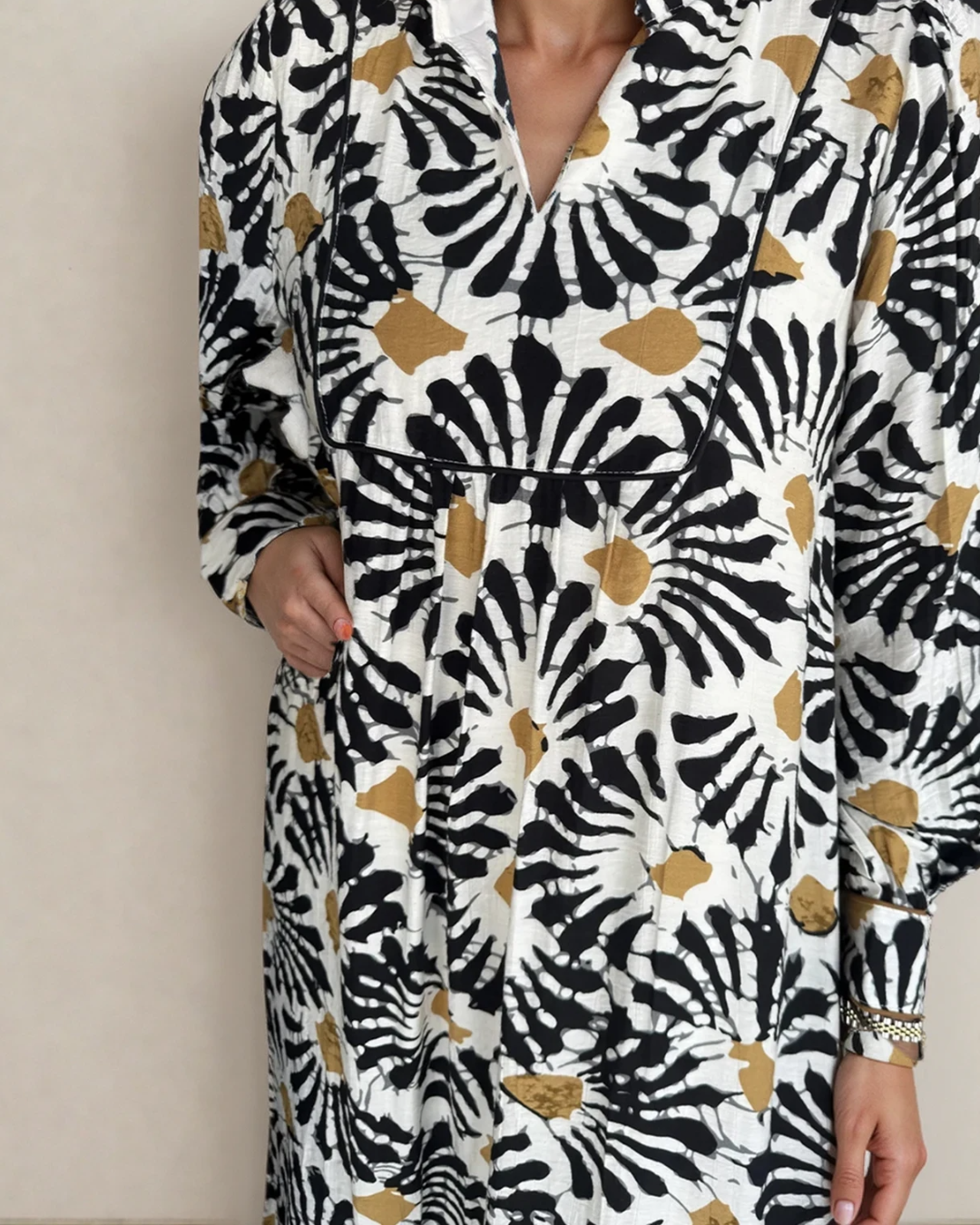 - It’s a perfect fall dress with abstract floral print.