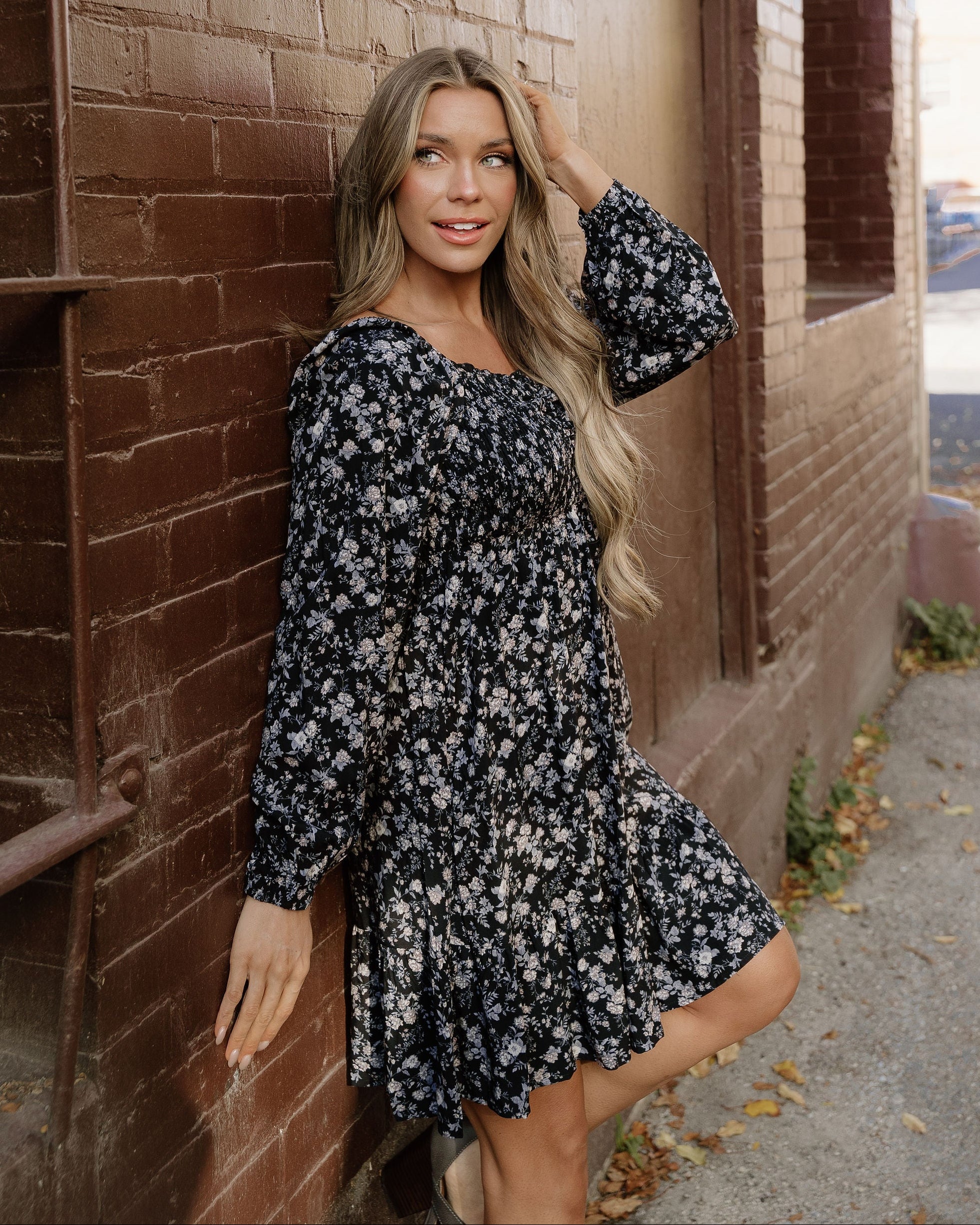 Isabella Long Sleeve Frilly Shirred Square Neck Mini Dress | Dropship