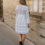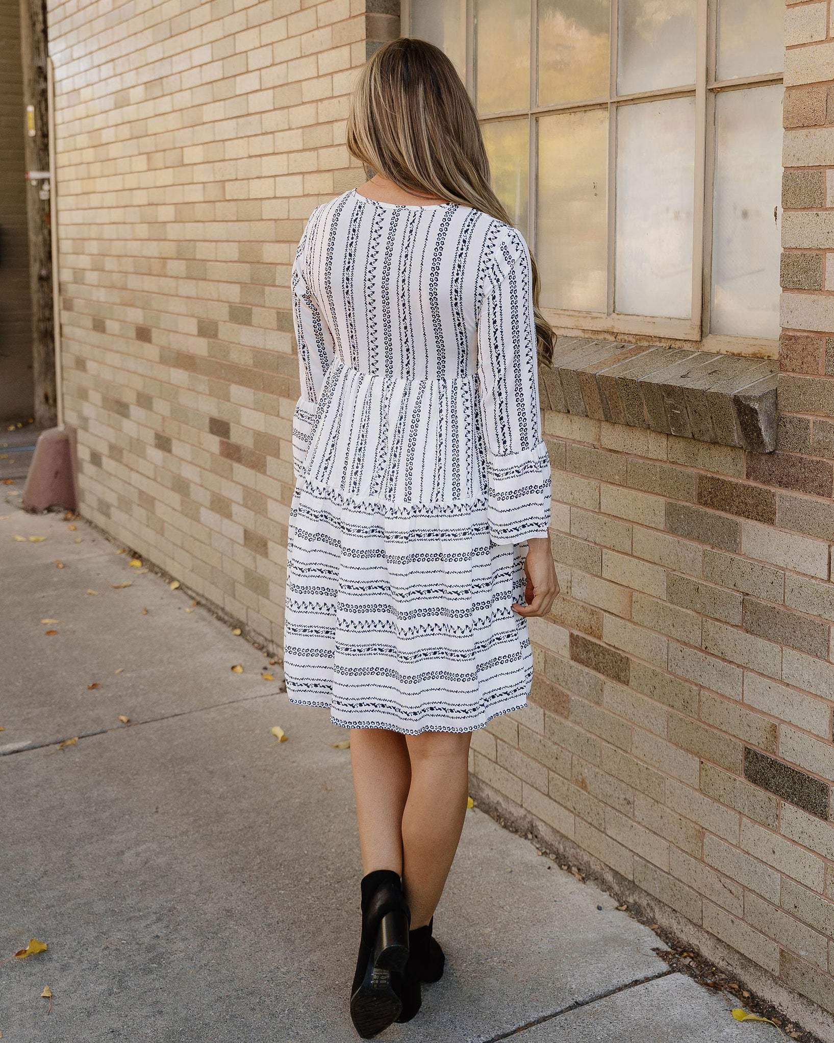 • Embrace the playful vibe of this dress with its charming bell sleeves that effortlessly sway with every movement.