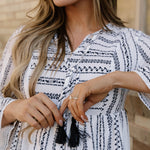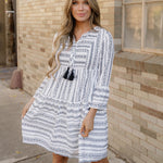 • Stand out in the crowd with the unique striped design and eye-catching fringe details of this mini dress.