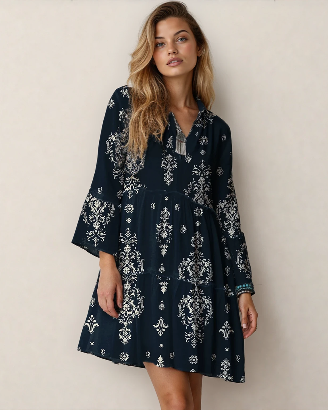 - This boho floral dress is sure to make a fashion statement.