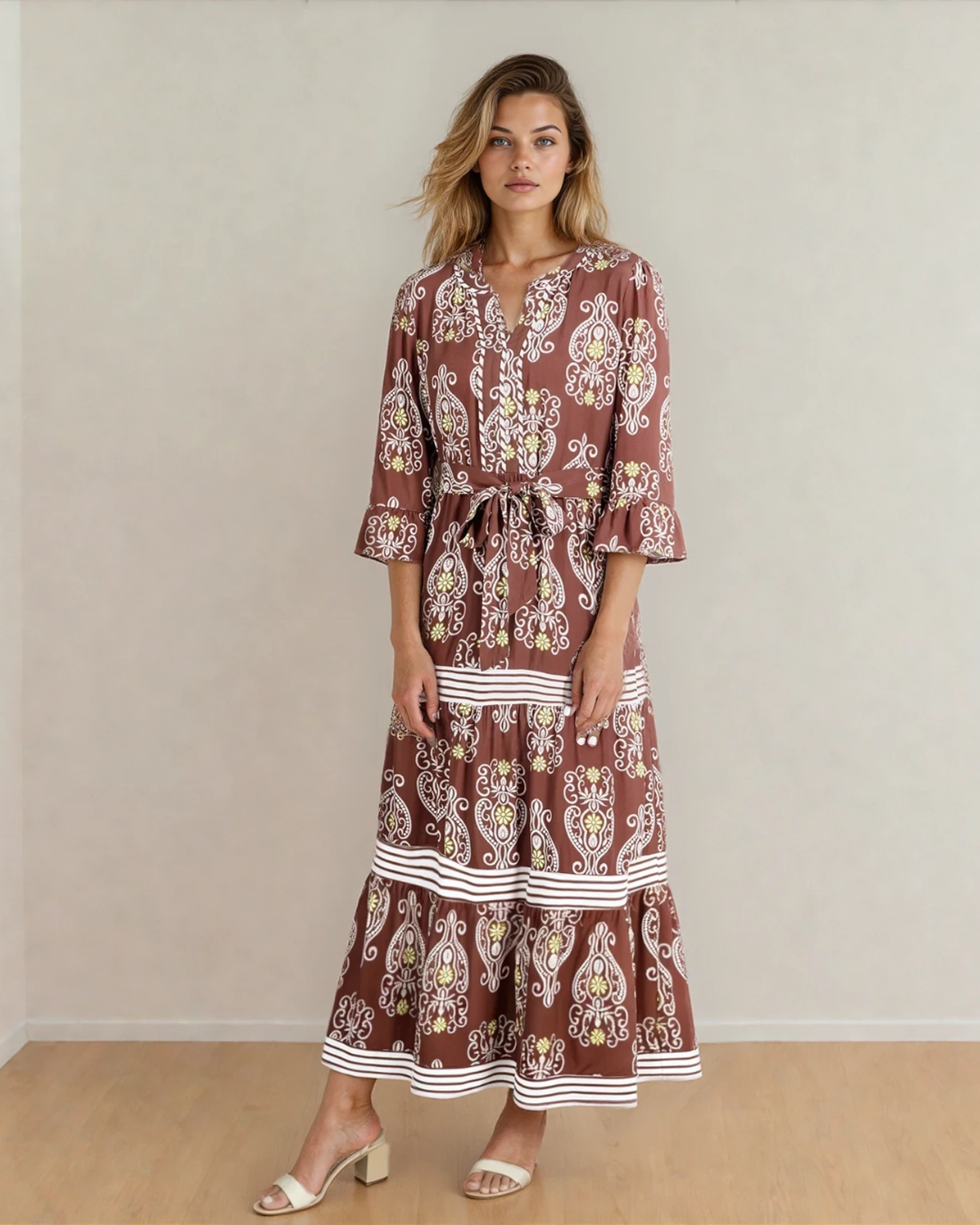 - Elegant floral print maxi dress with chic striped trim details.