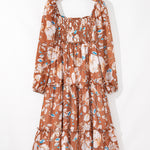 - Elevate your boho-chic style with our Maxi Dress featuring delicate frill details and a flattering shirred square neckline.