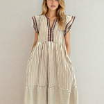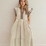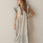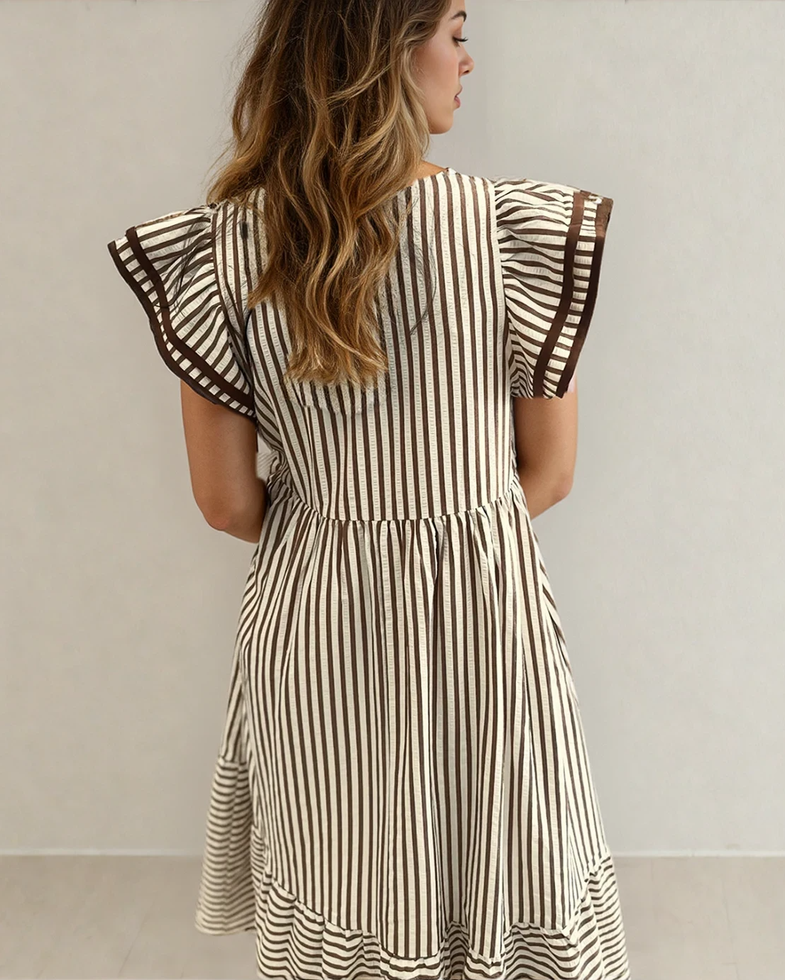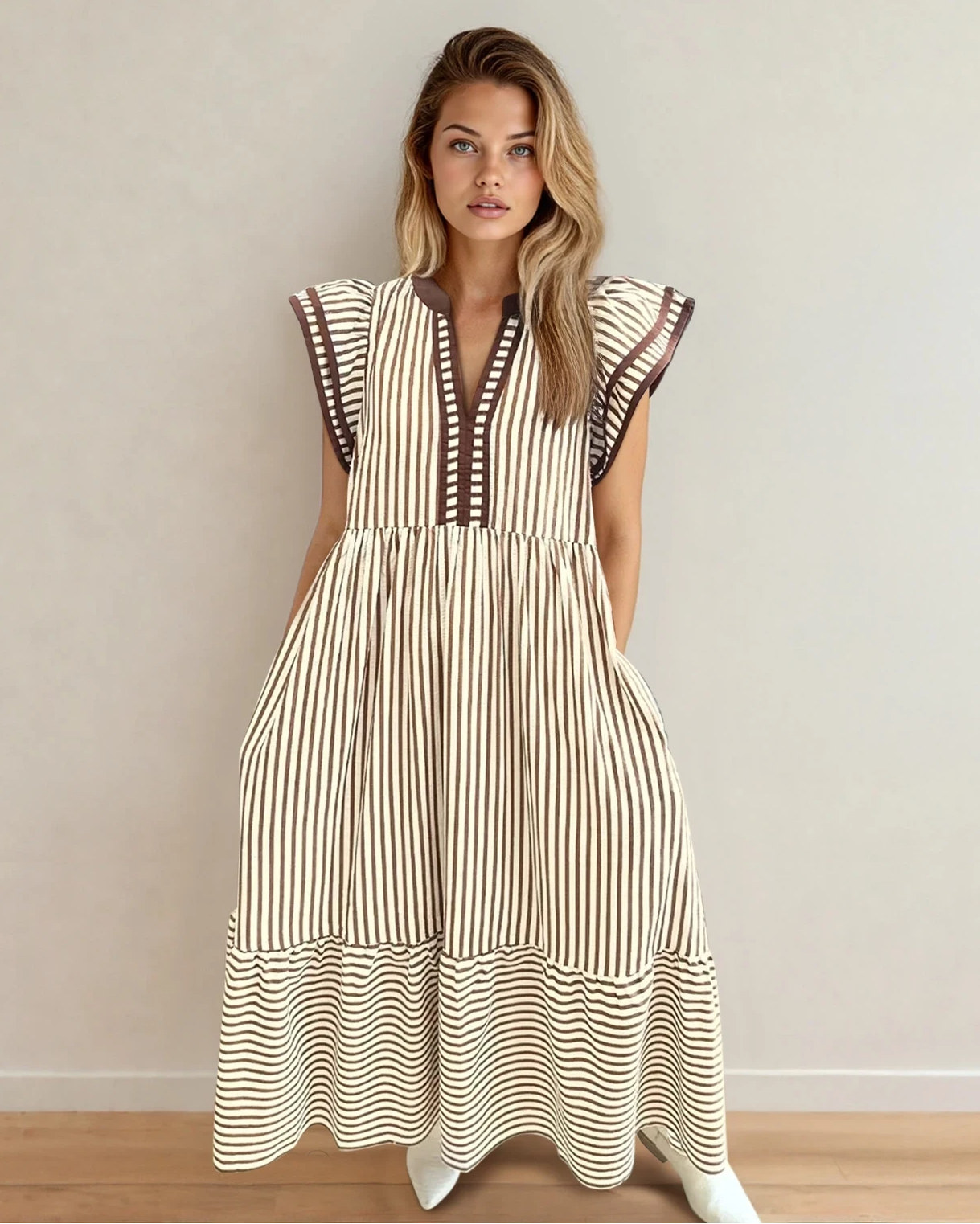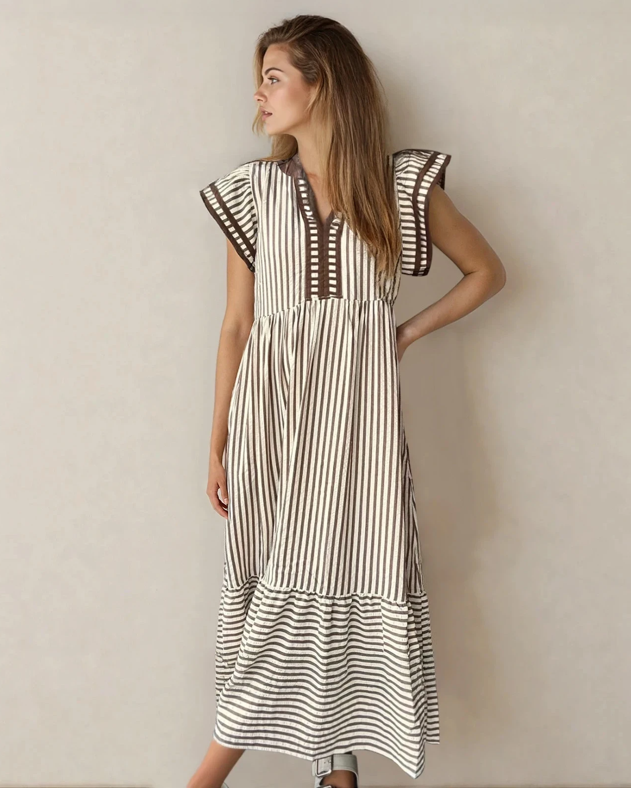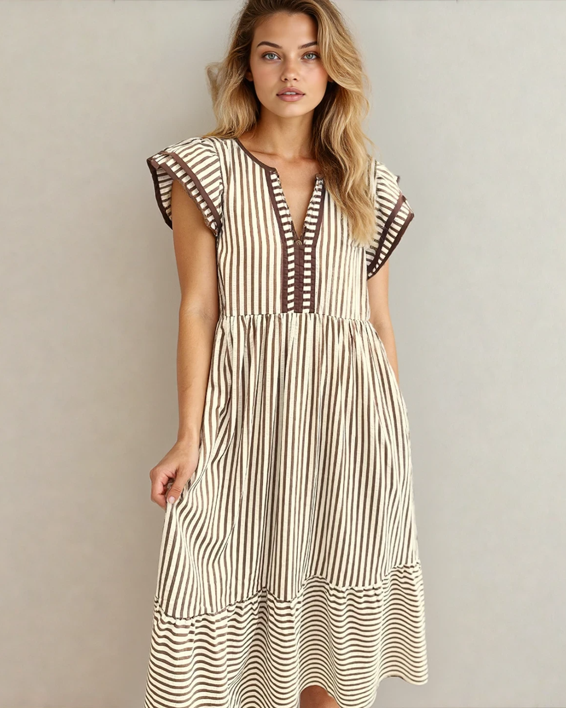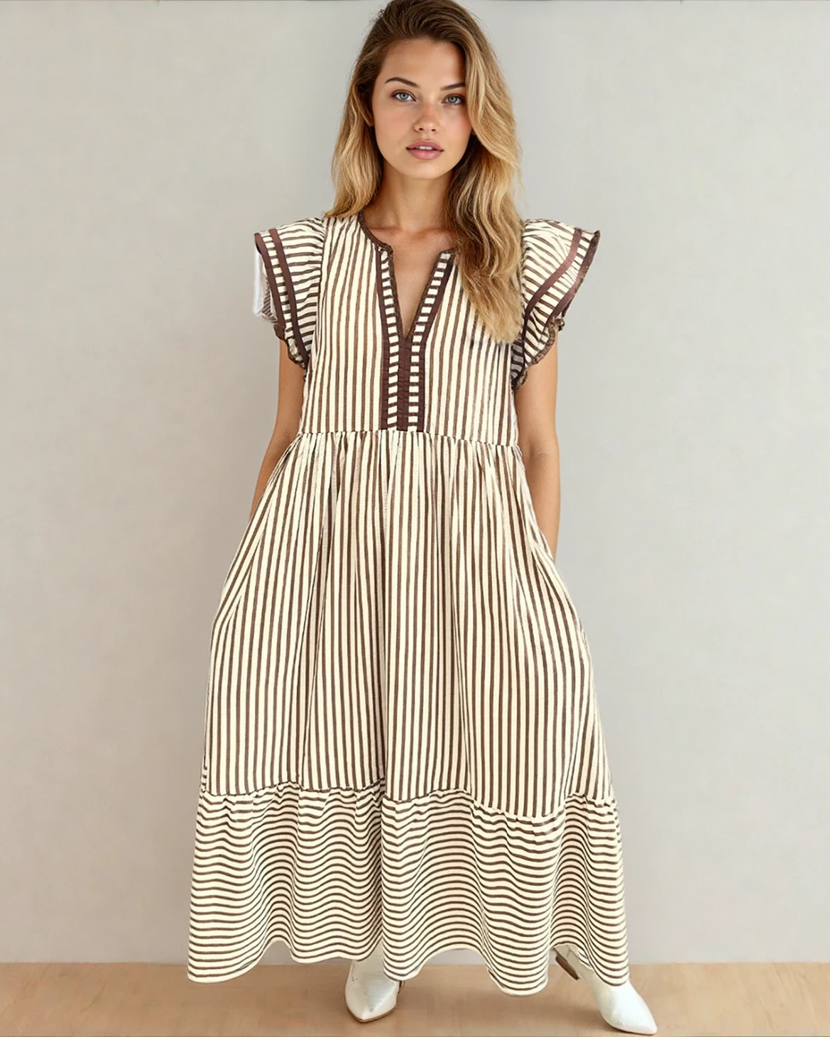 - Striped midi dress with double ruffled sleeves adds feminine charm to your look.