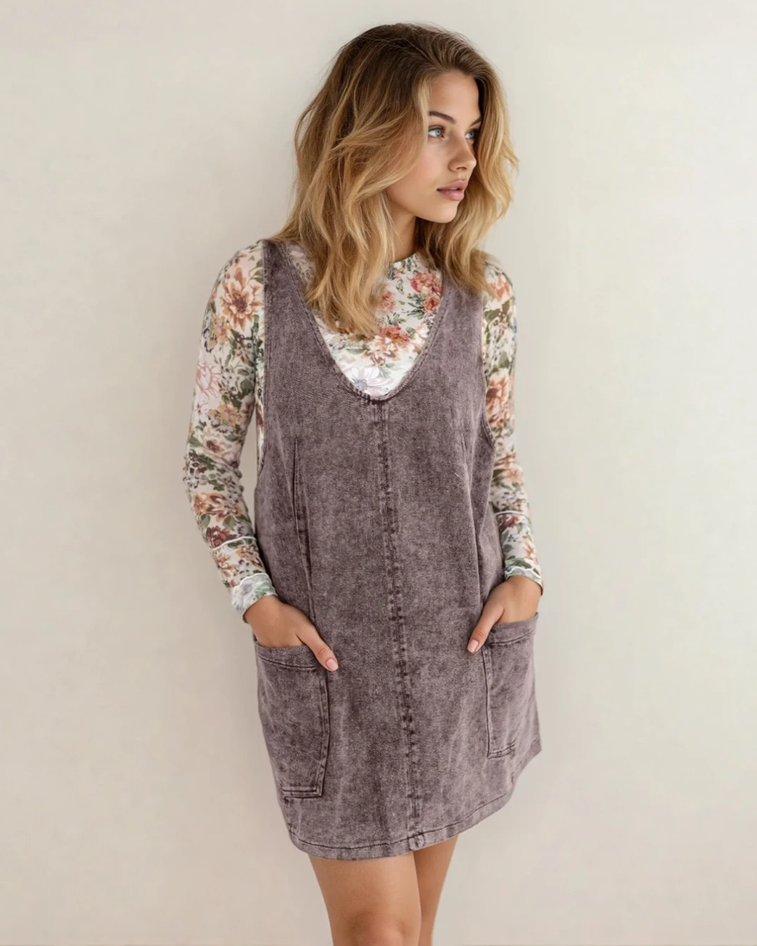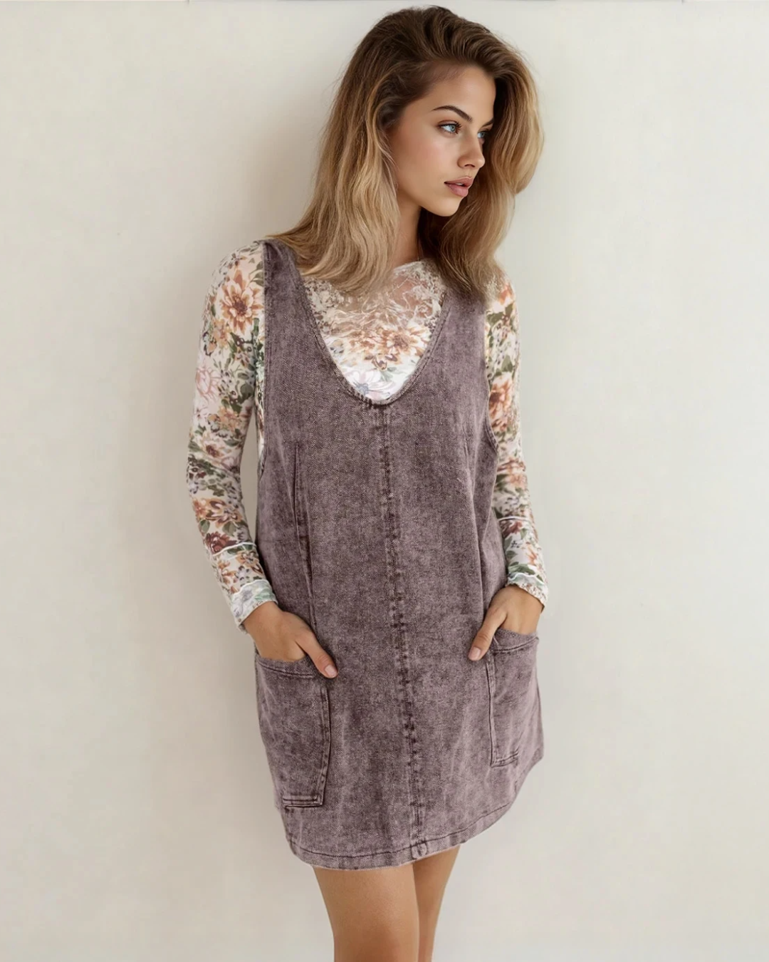 PREORDER Kylie Vintage Washed Denim V Neck Suspender Mini Dress | Dropship