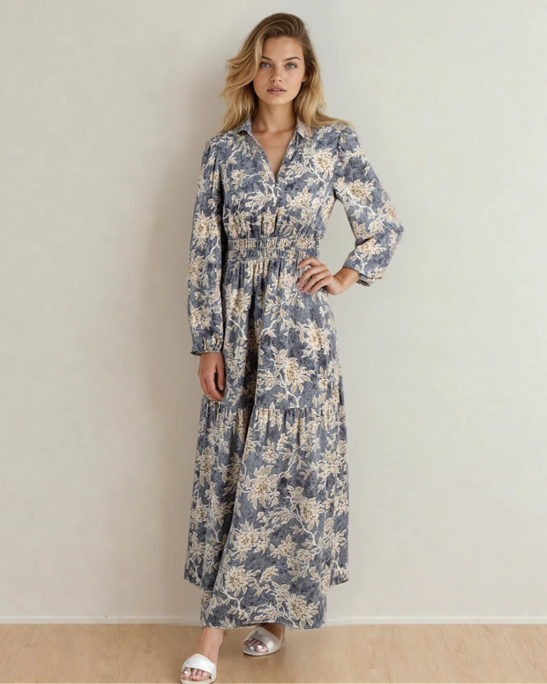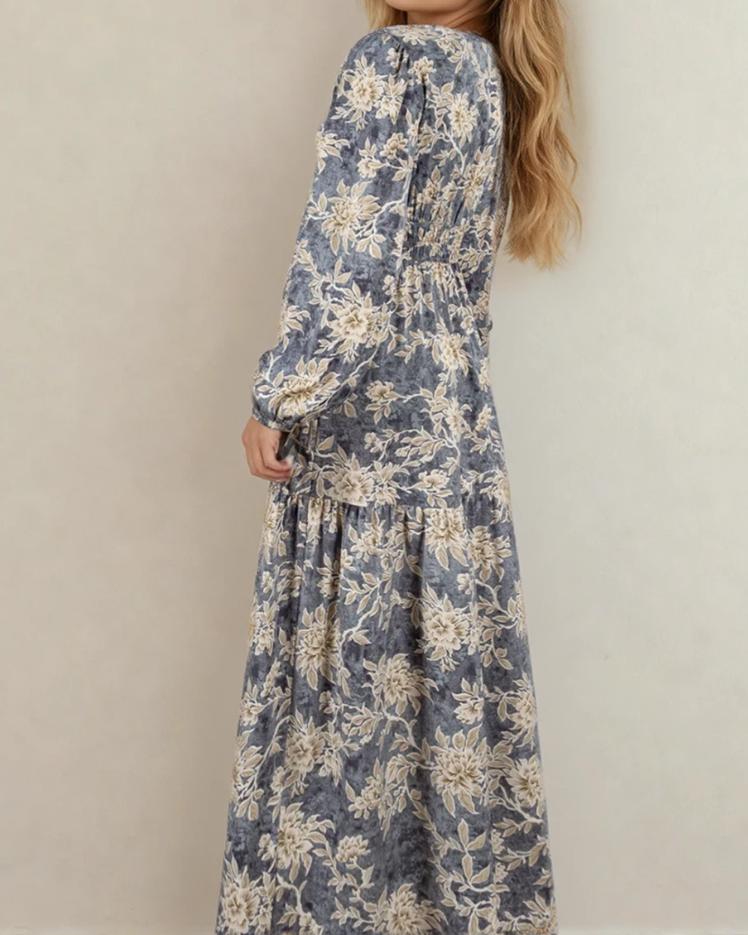 PREORDER Brianna Floral Print Smocked High Waist Long Sleeve Maxi Dress - Blue | Dropship