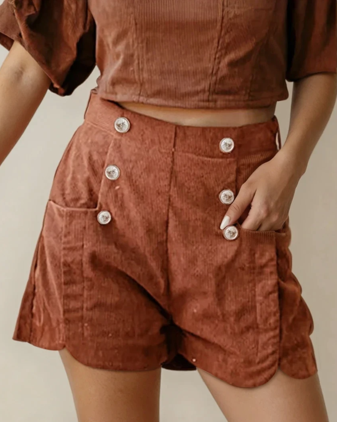 Sienna Button Decor Scalloped Edge High Waist Corduroy Shorts | Dropship