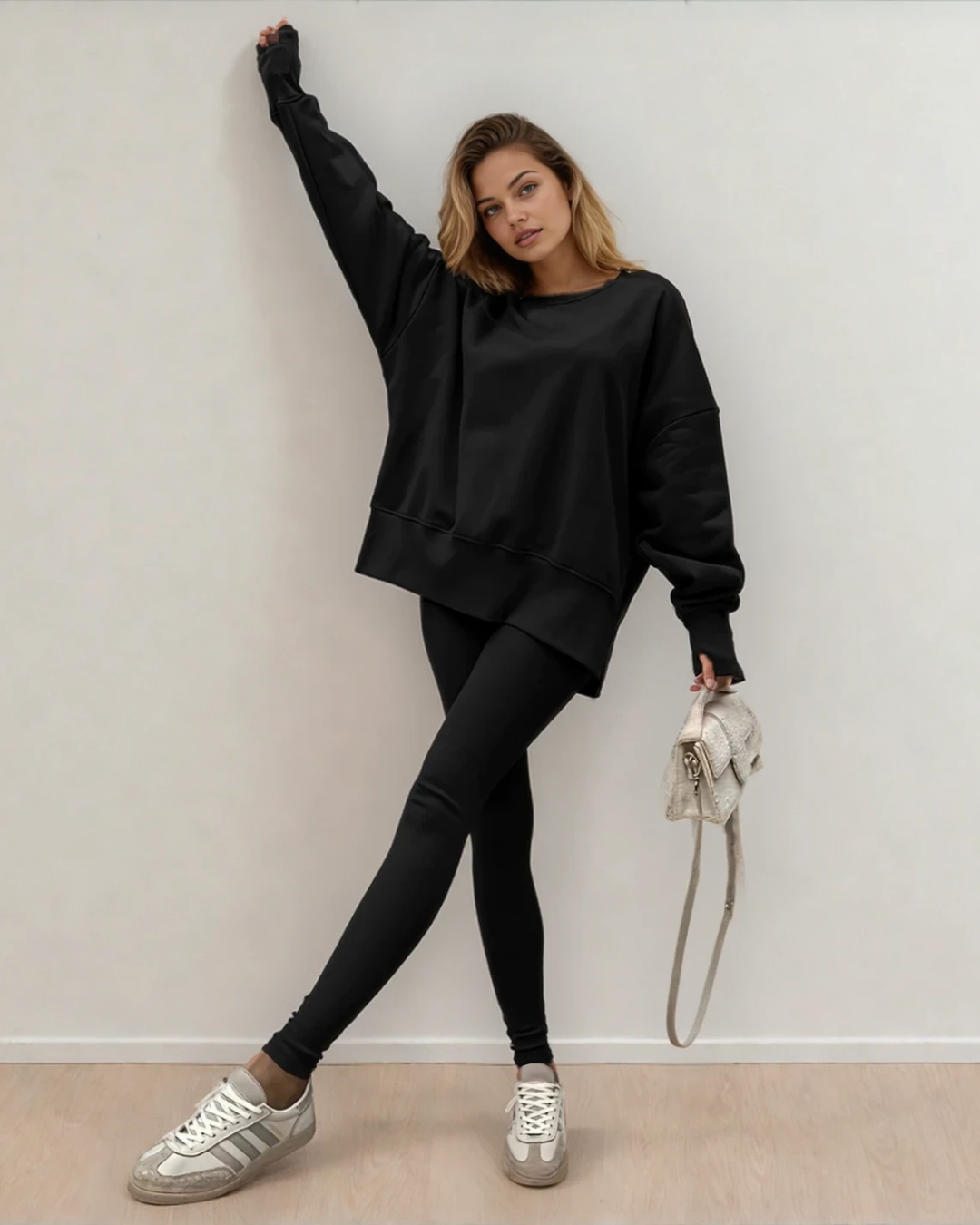 Remi Solid Color Oversize Slit Sweatshirt Ribbed Leggings 2pcs Set - Black | Dropship