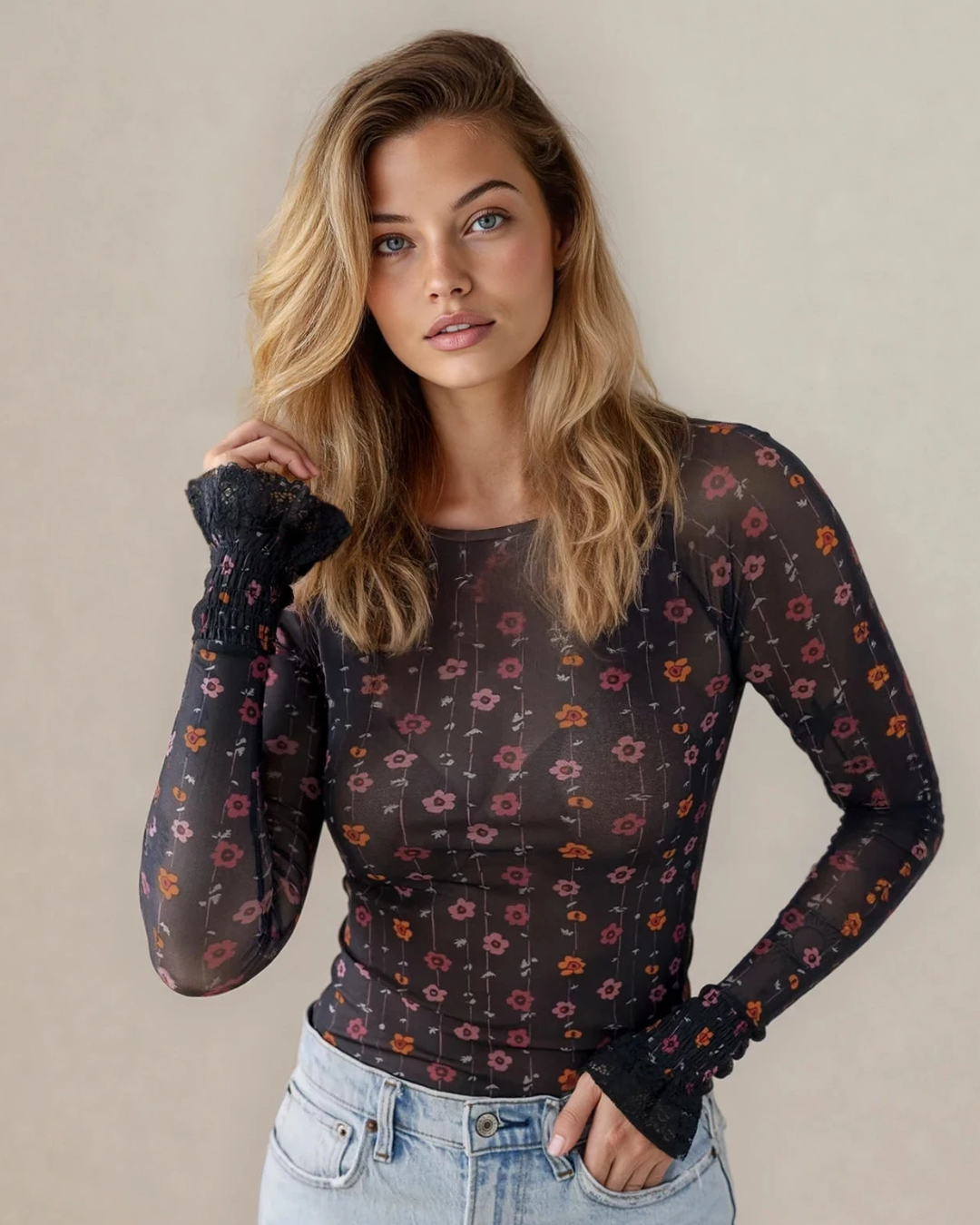 Malani Neck Floral Print Mesh Long Sleeve Top | Dropship