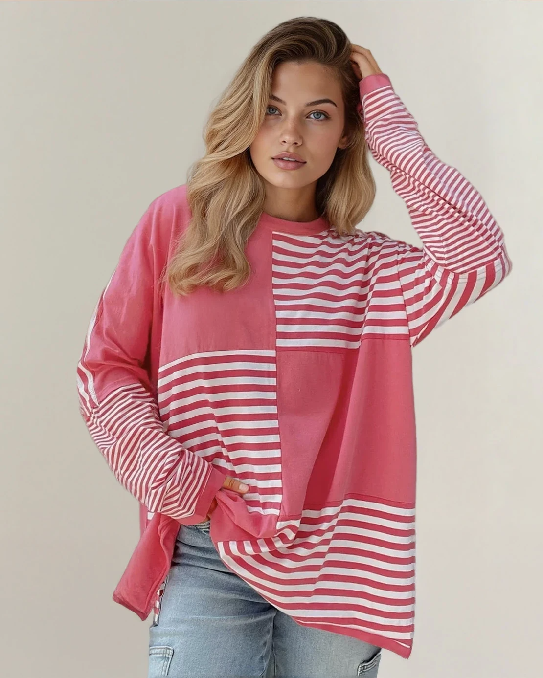 Natalie Stripe Color Block Patchwork Drop Shoulder Long Sleeve Tunic Top | Dropship