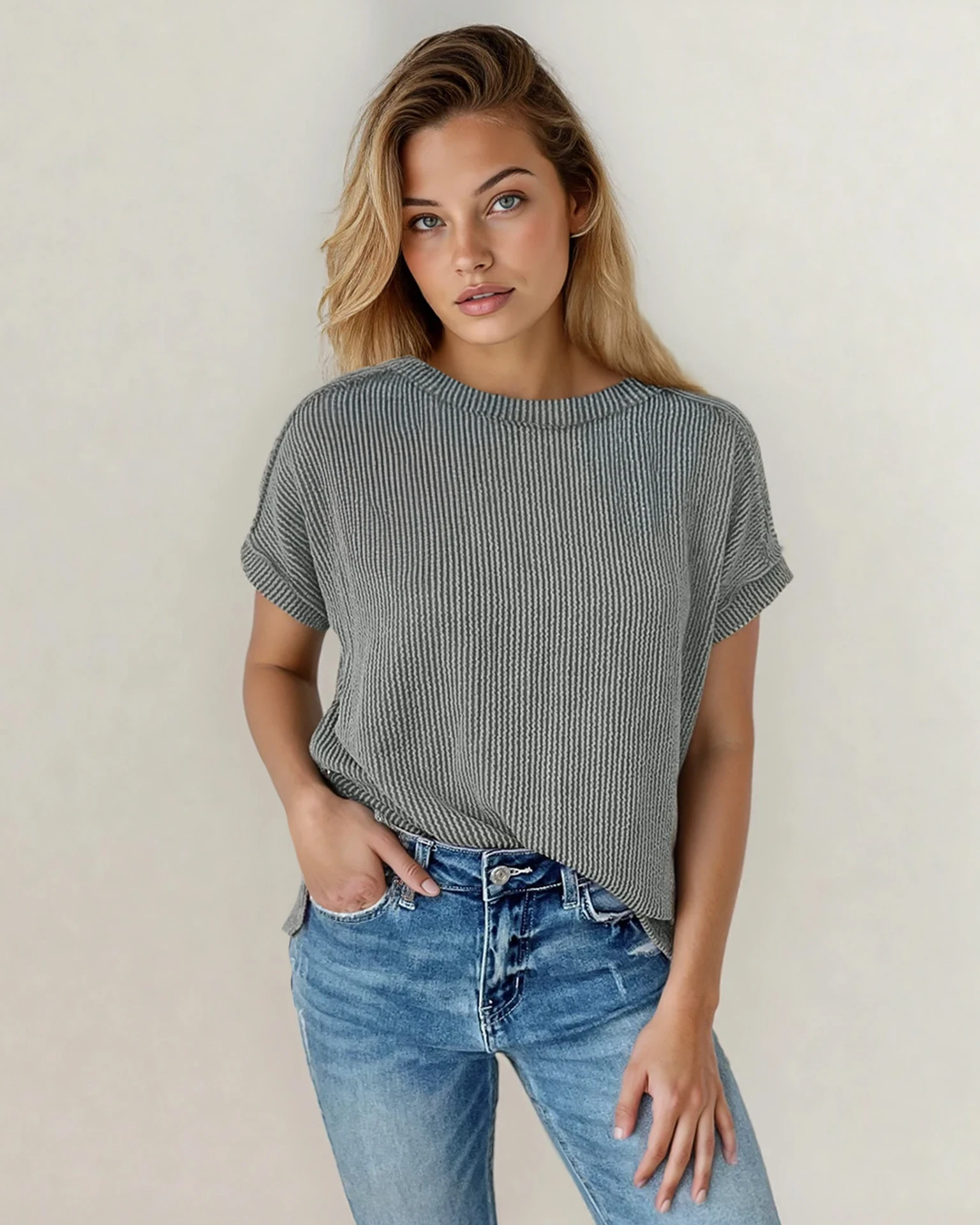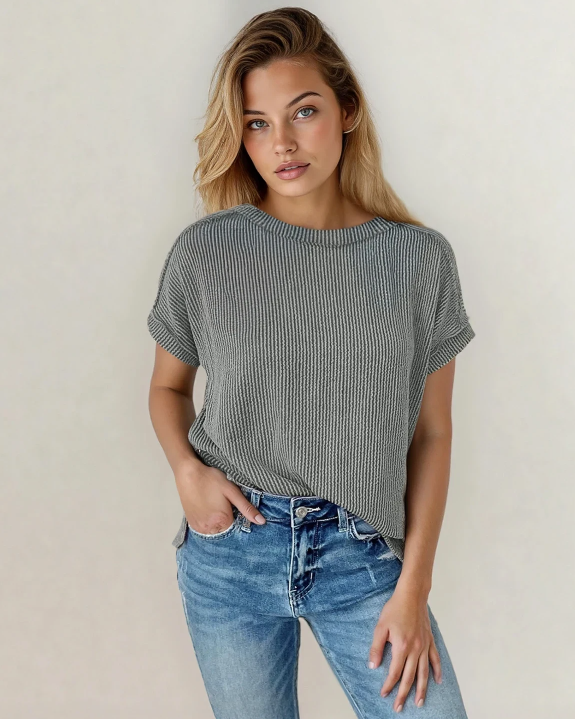 Hadley Crinkle Rib Knit Exposed Seam Round Neck T-shirt | Dropship