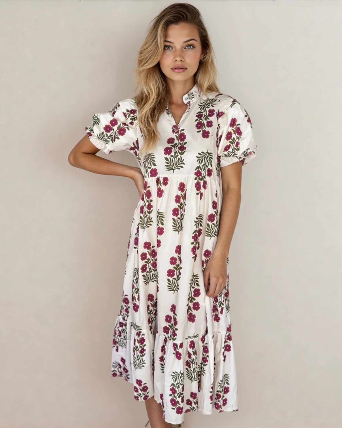 Kali Floral Short Bubble Sleeve Tiered Maxi Dress - Beige | Dropship