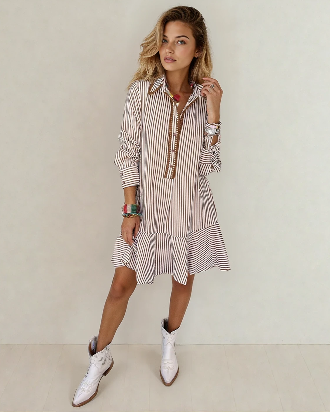 Gracie Stripe Shirt Collar Embroidered Trim Ruffle Hem Long Sleeve Mini Dress | Dropship