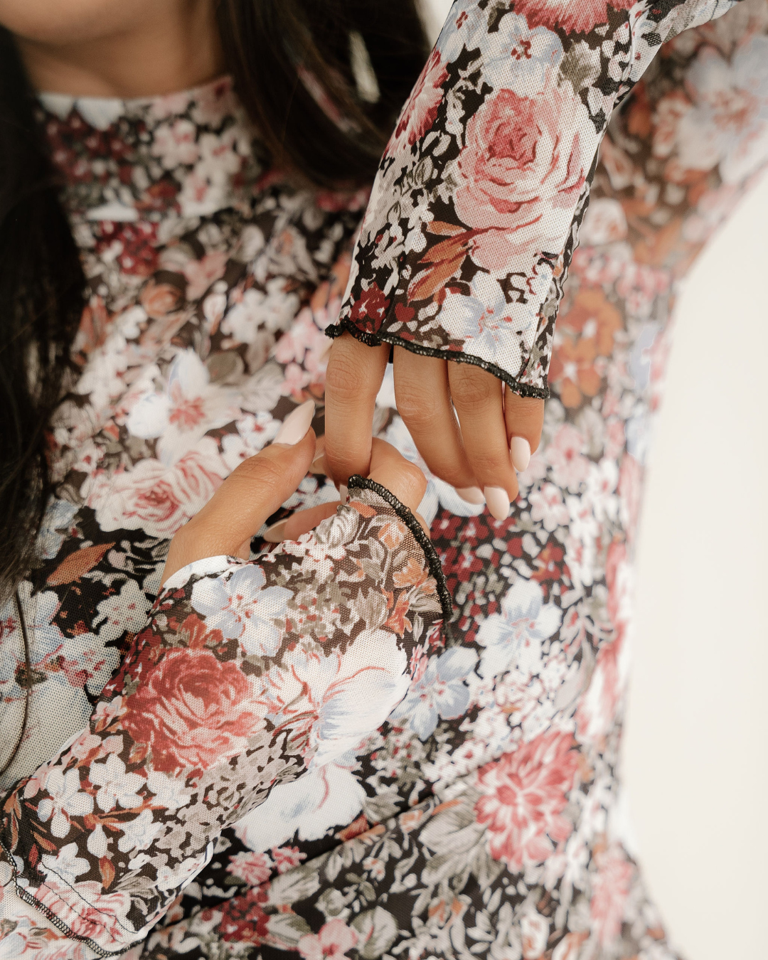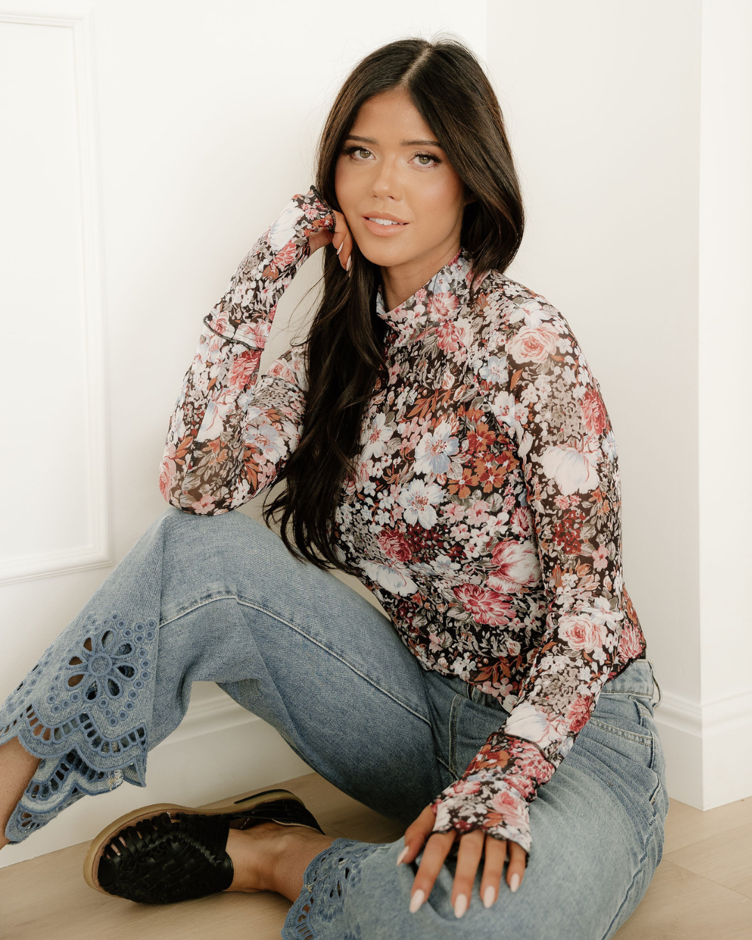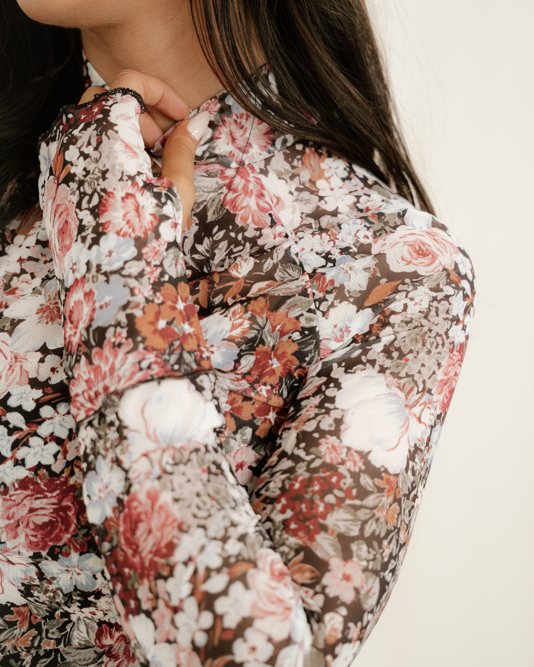 Raelynn Floral Print Mesh Mock Neck Slim Blouse - Brown