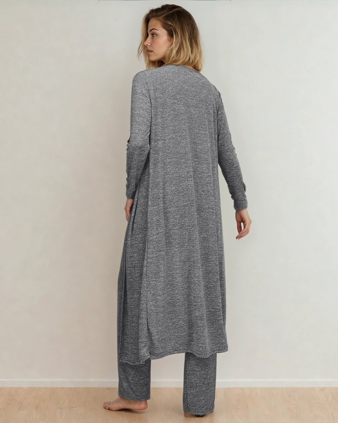 Including a tee, loose pants, and a long cardigan.