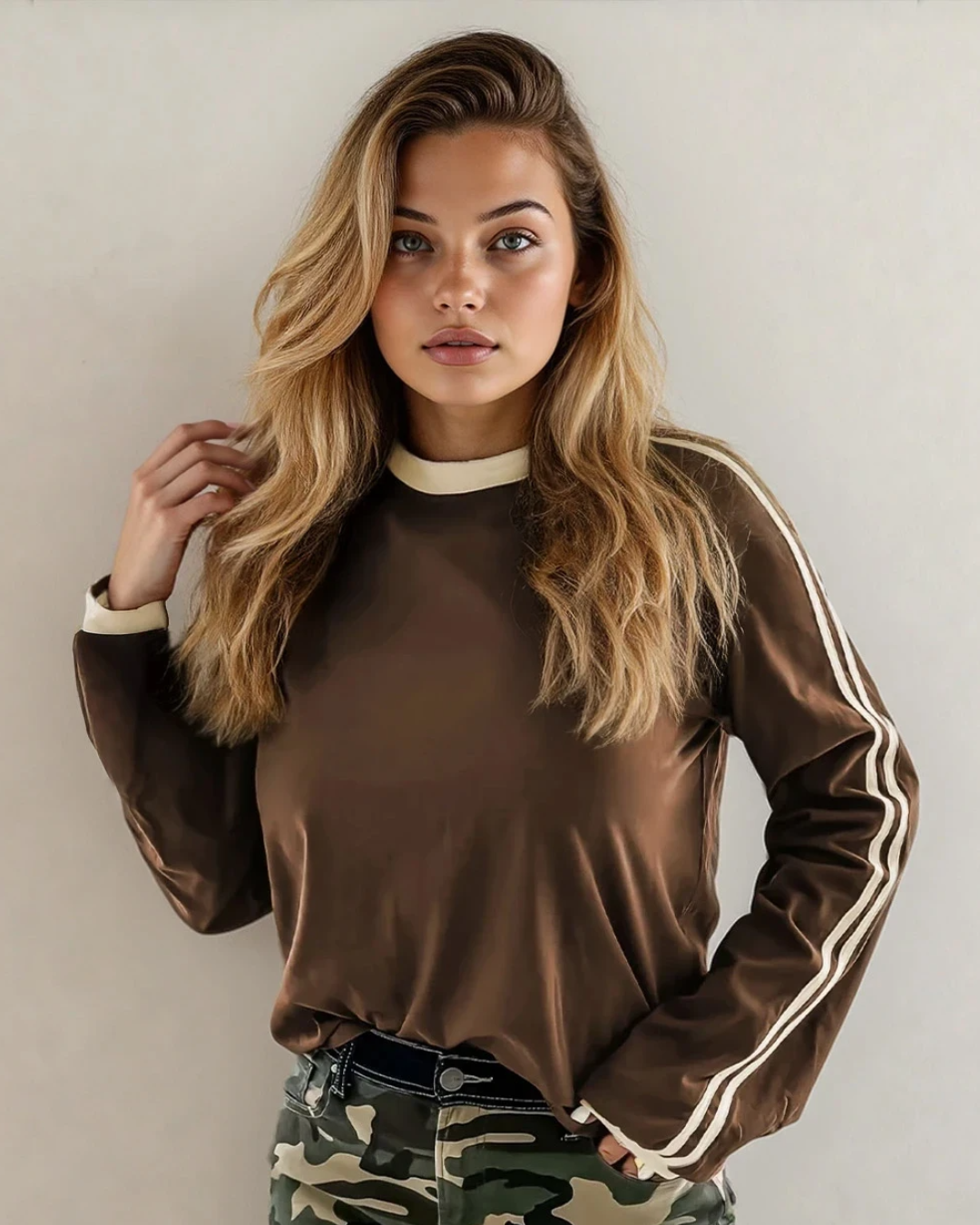 Malani Varsity Striped Crew Neck Long Sleeve Top - Dark Brown