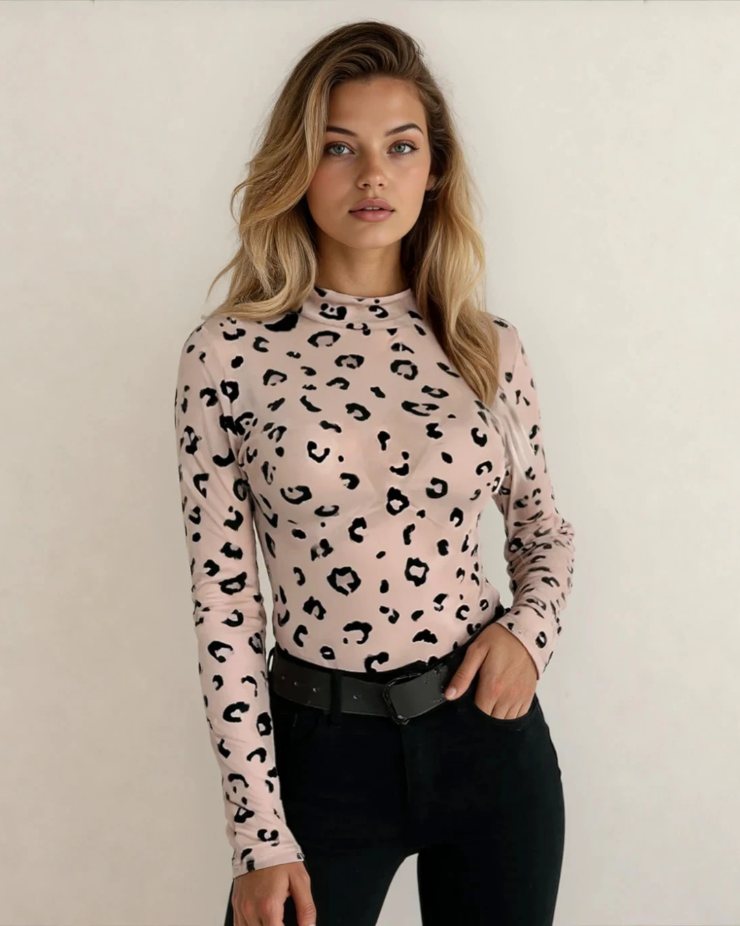 Oaklynn Mock Neck Sheer Mesh Leopard Long Sleeve Bodysuit
