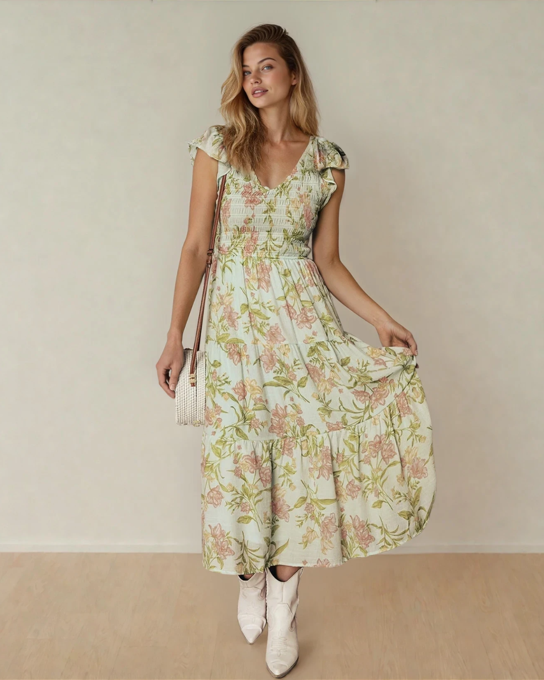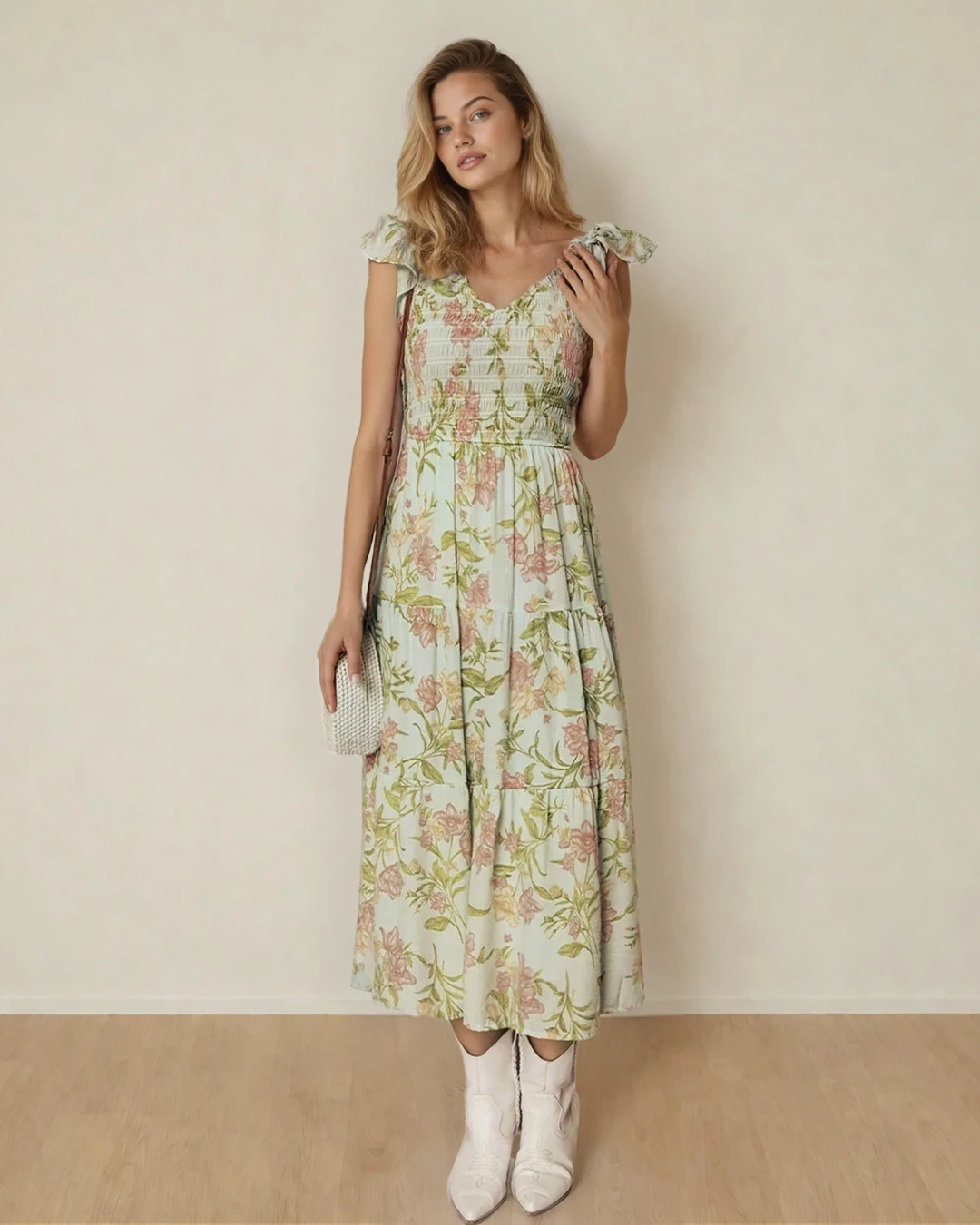 Kennedy Smocked Bodice Ruffled Sleeveless Tiered Floral Maxi Dress (wait for sample)
