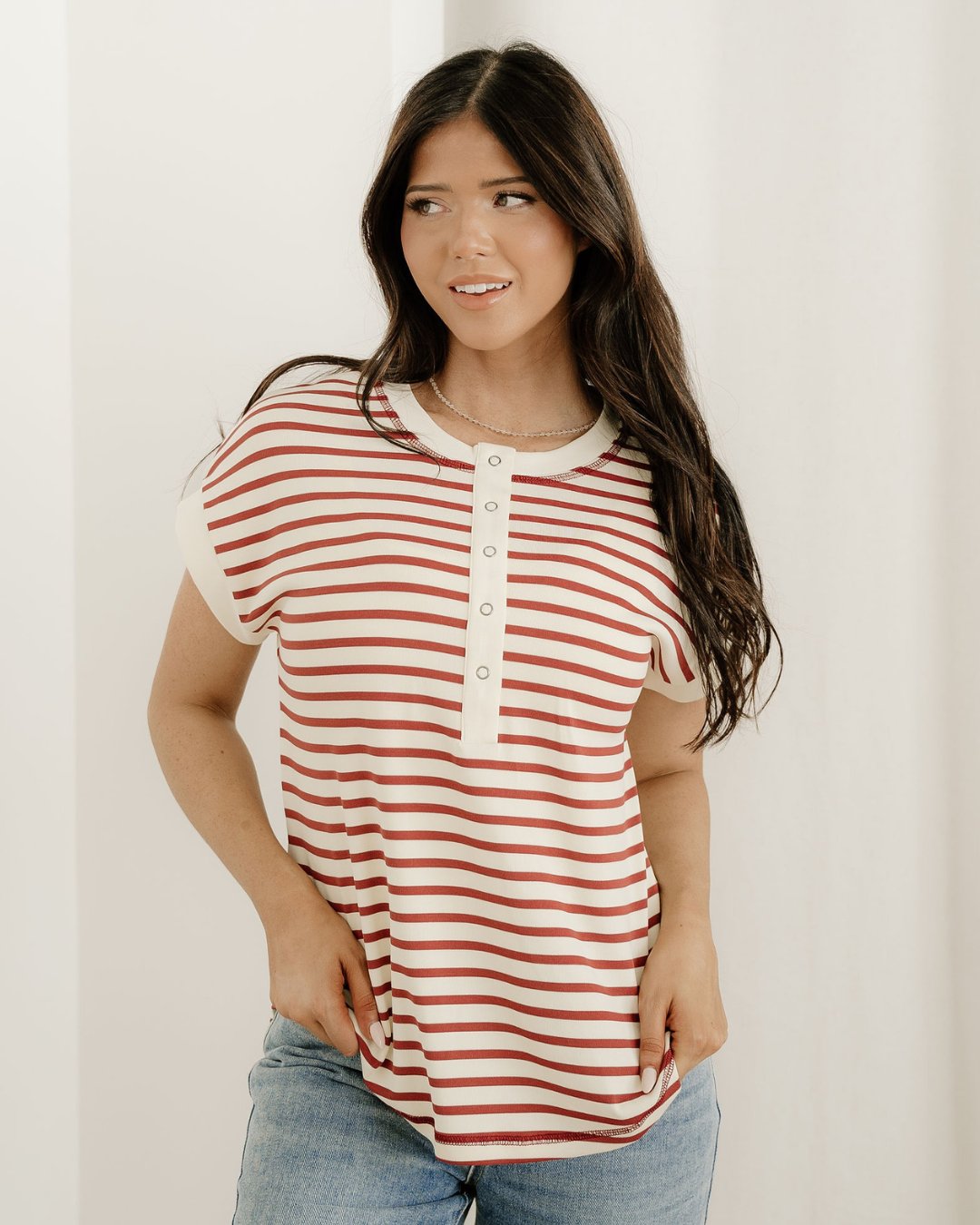 Maisie Stripe Half Buttons Round Neck T Shirt - Red