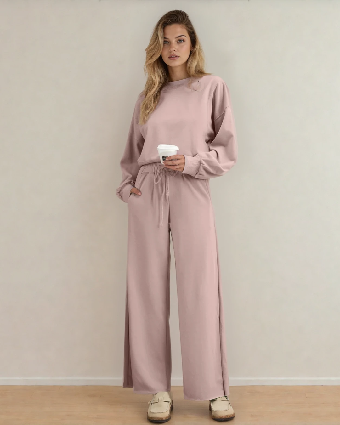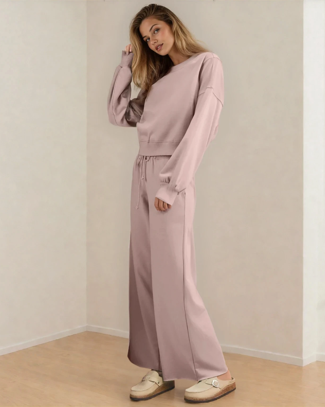 Miles Crop Pullover Drawstring Wide Leg Pants Set - Pink