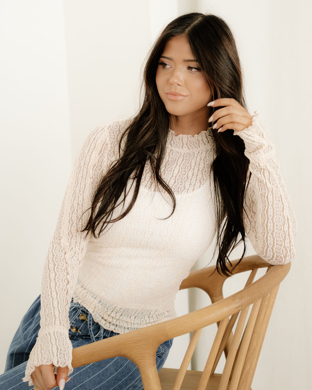 Molly Long Sleeve Mock Neck Sheer Lace Top - Apricot