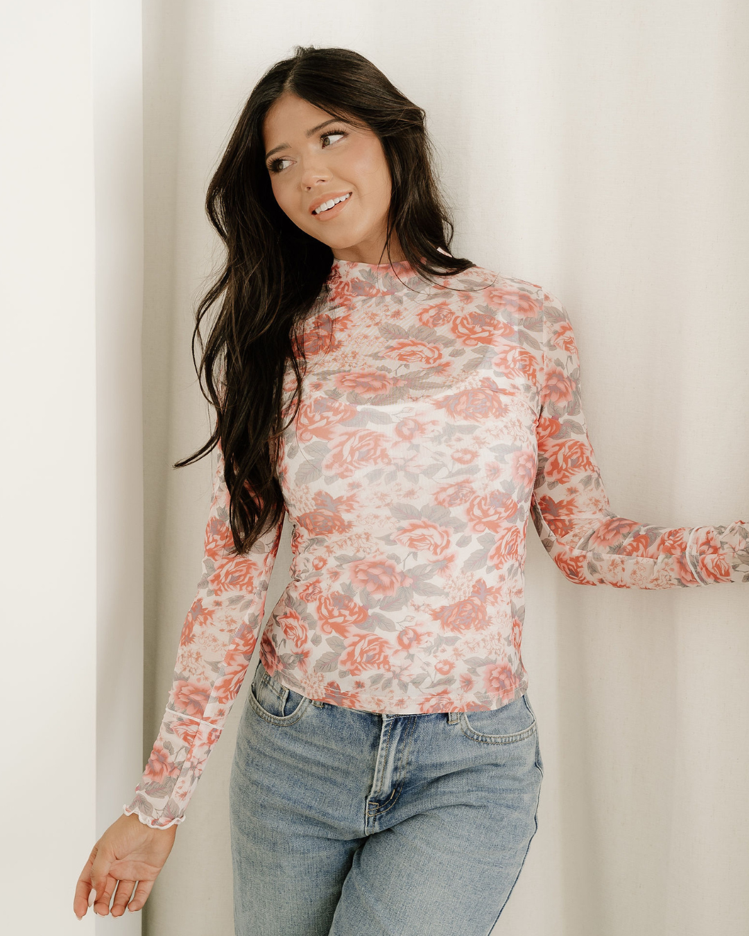 Malani Neck Floral Print Mesh Long Sleeve Top