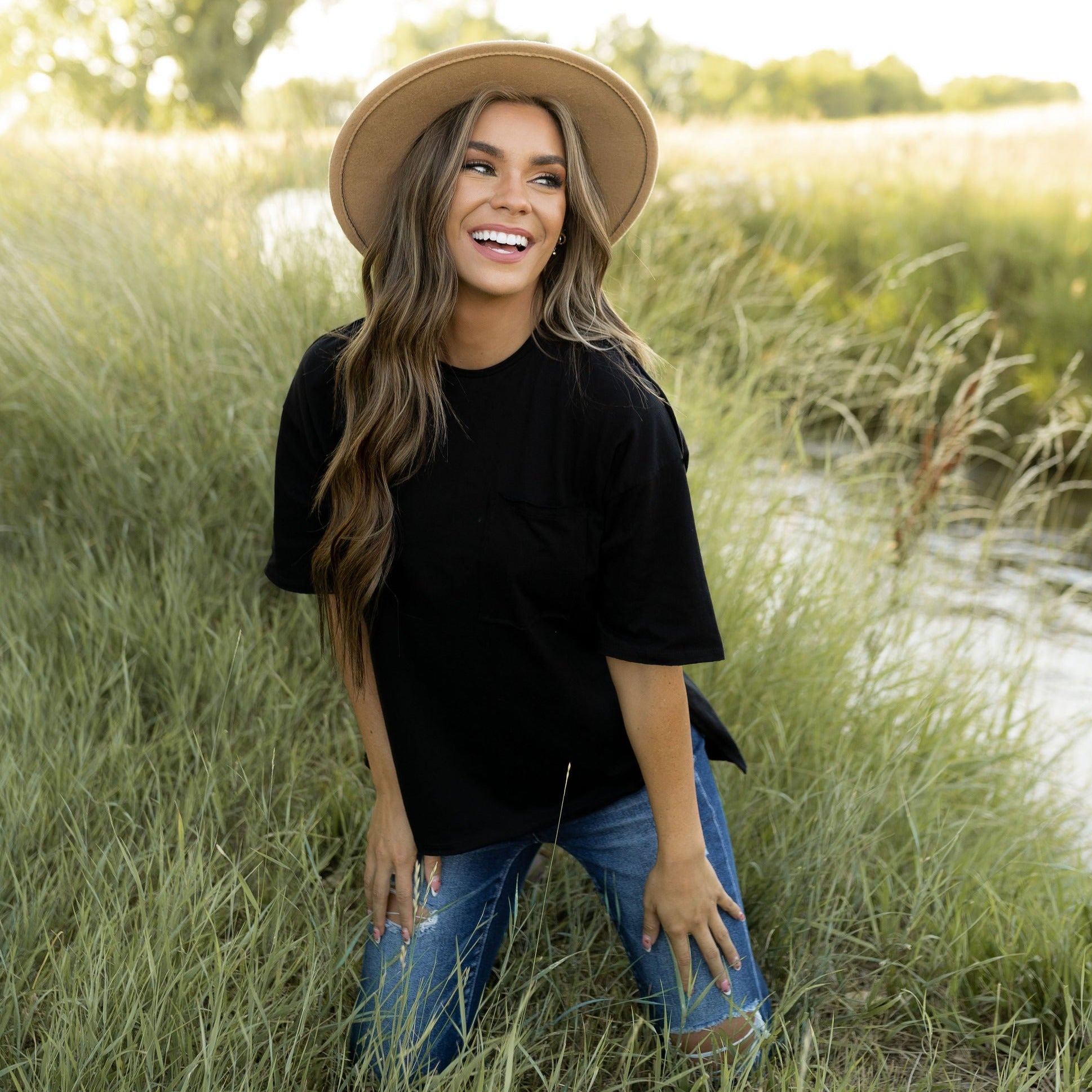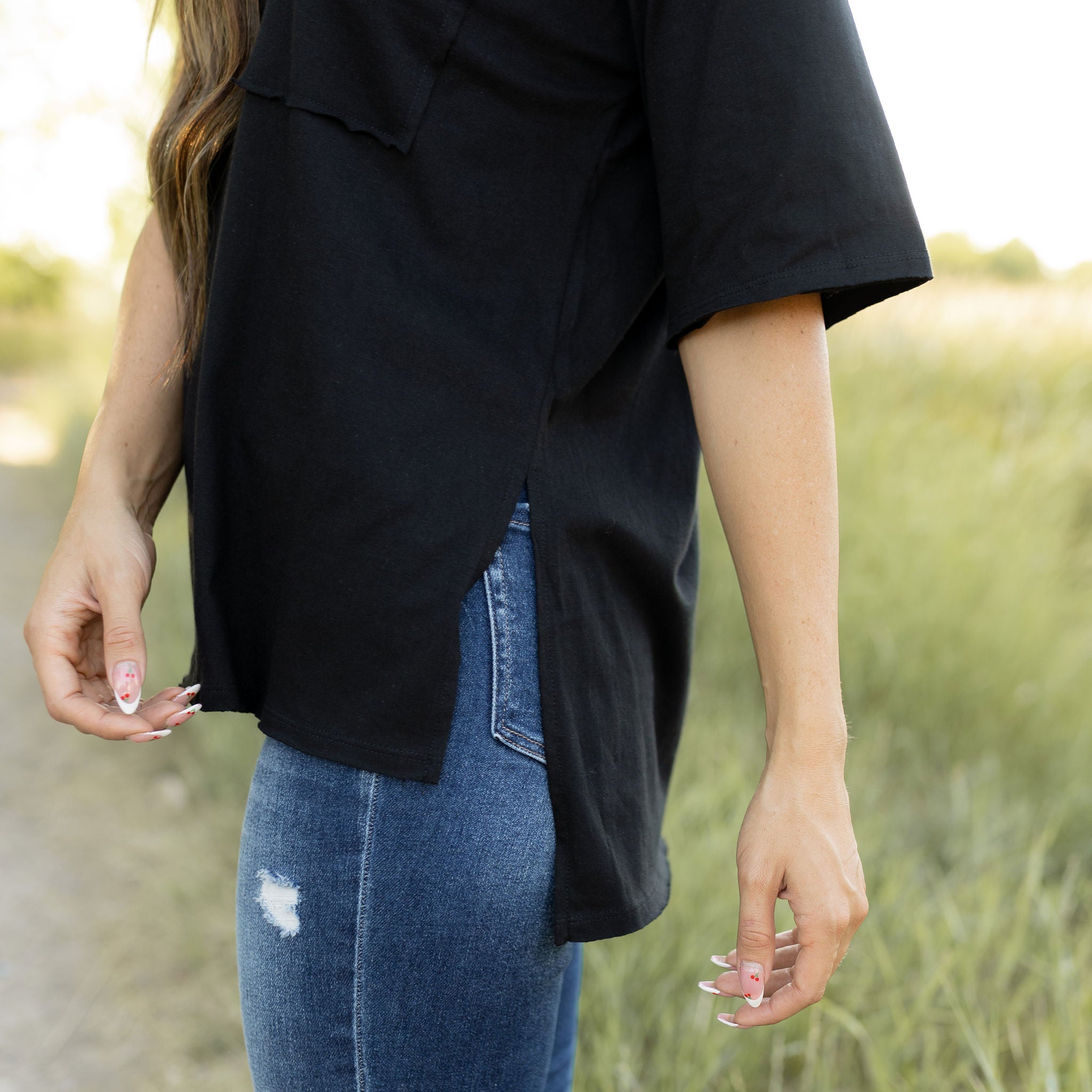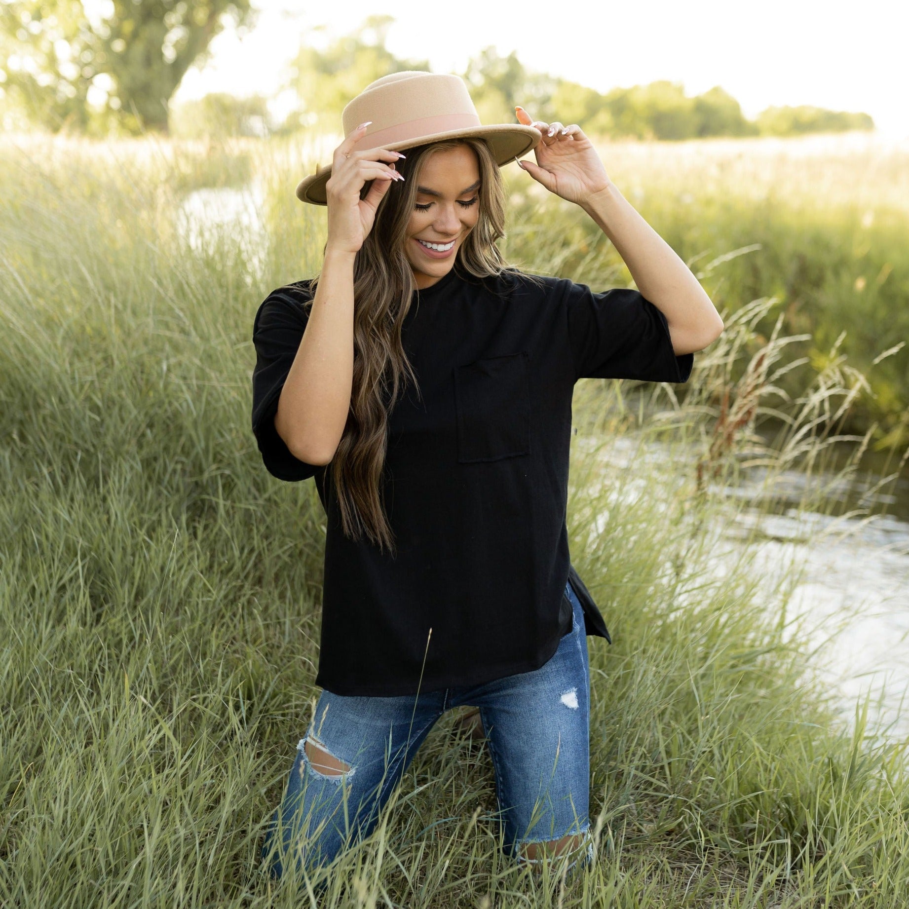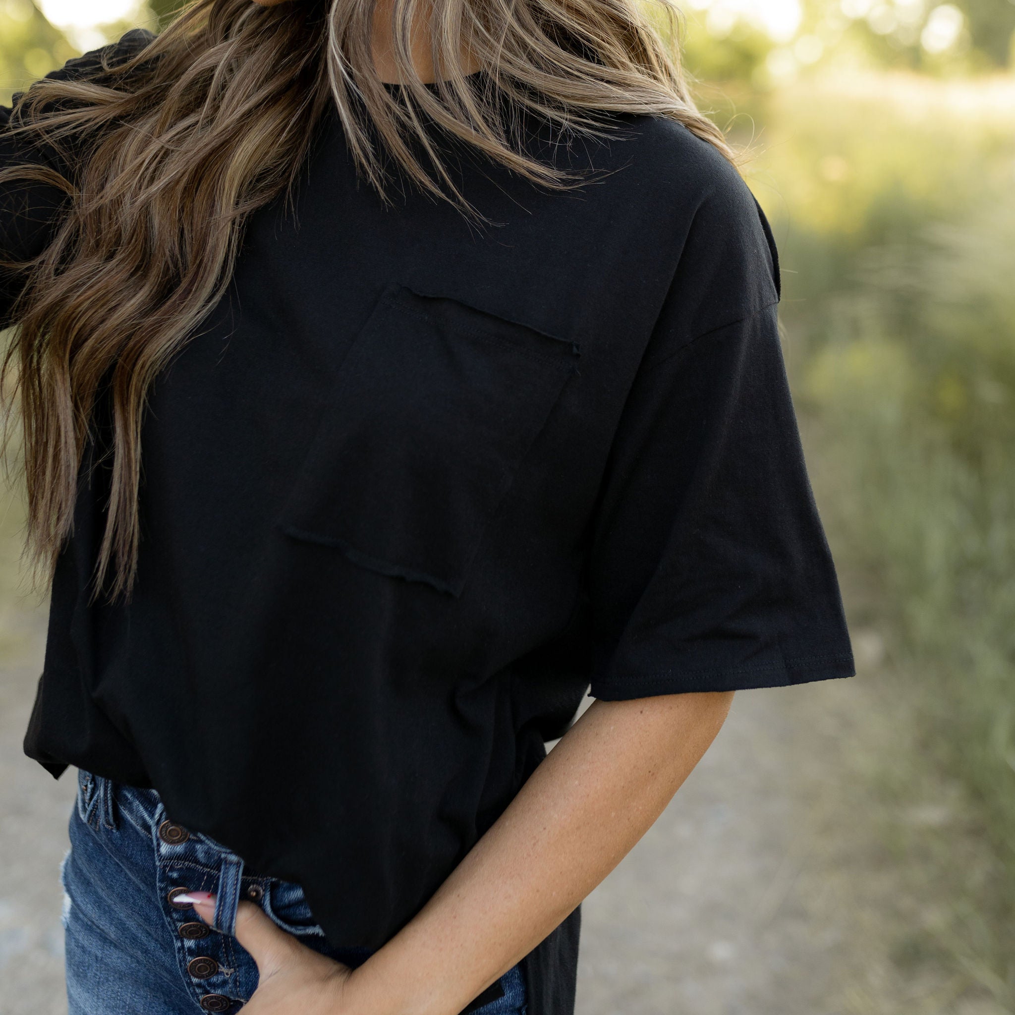 Stepping up your basic tee with seam and pleating detail on the back. This one features a front pocket and raw hems.