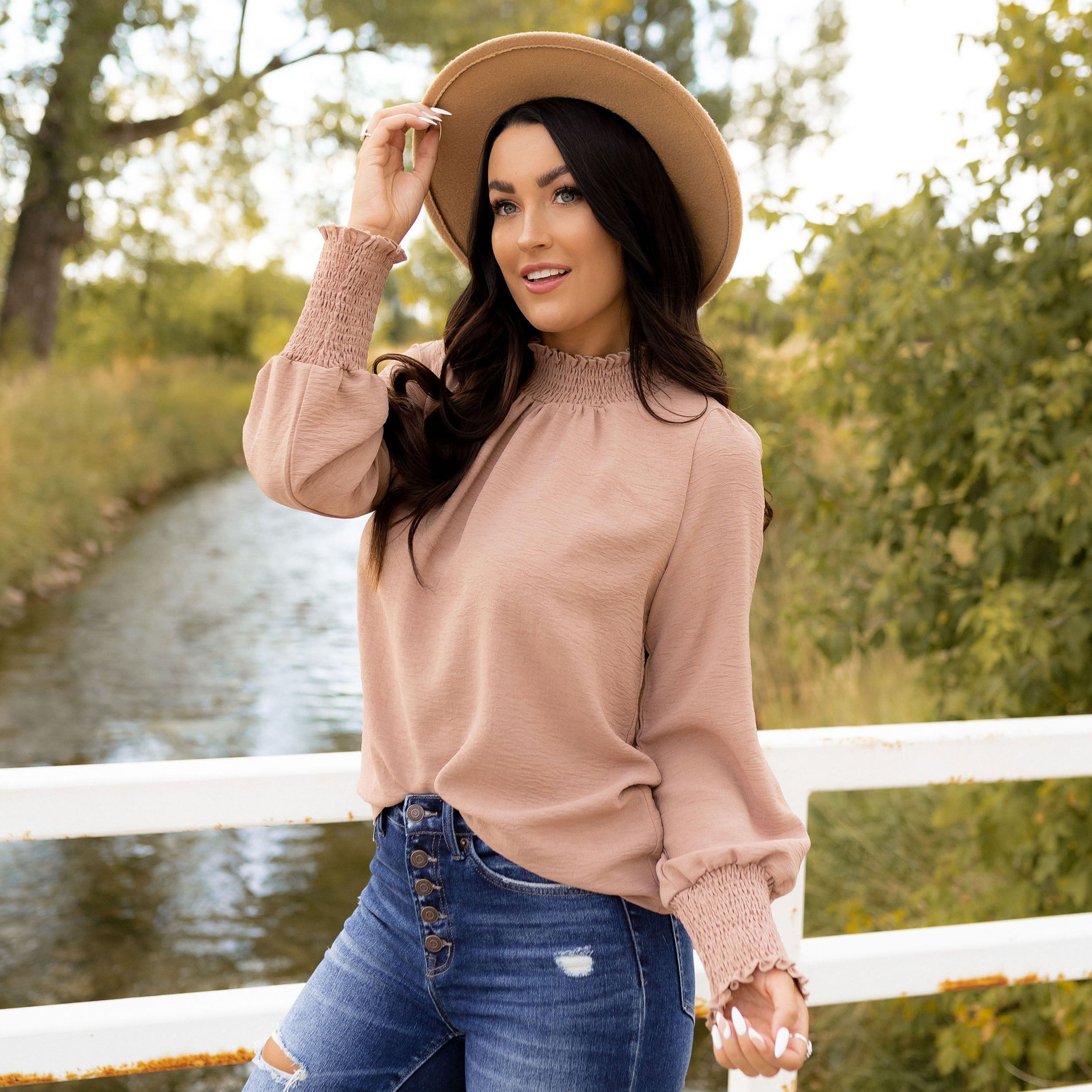 The details on our Cora Blouse are out of this world! The high neck and sleeve have adorable rushing. This one is perfect for those days that you want to feel a little more comfortable or dress up for a night on the town.