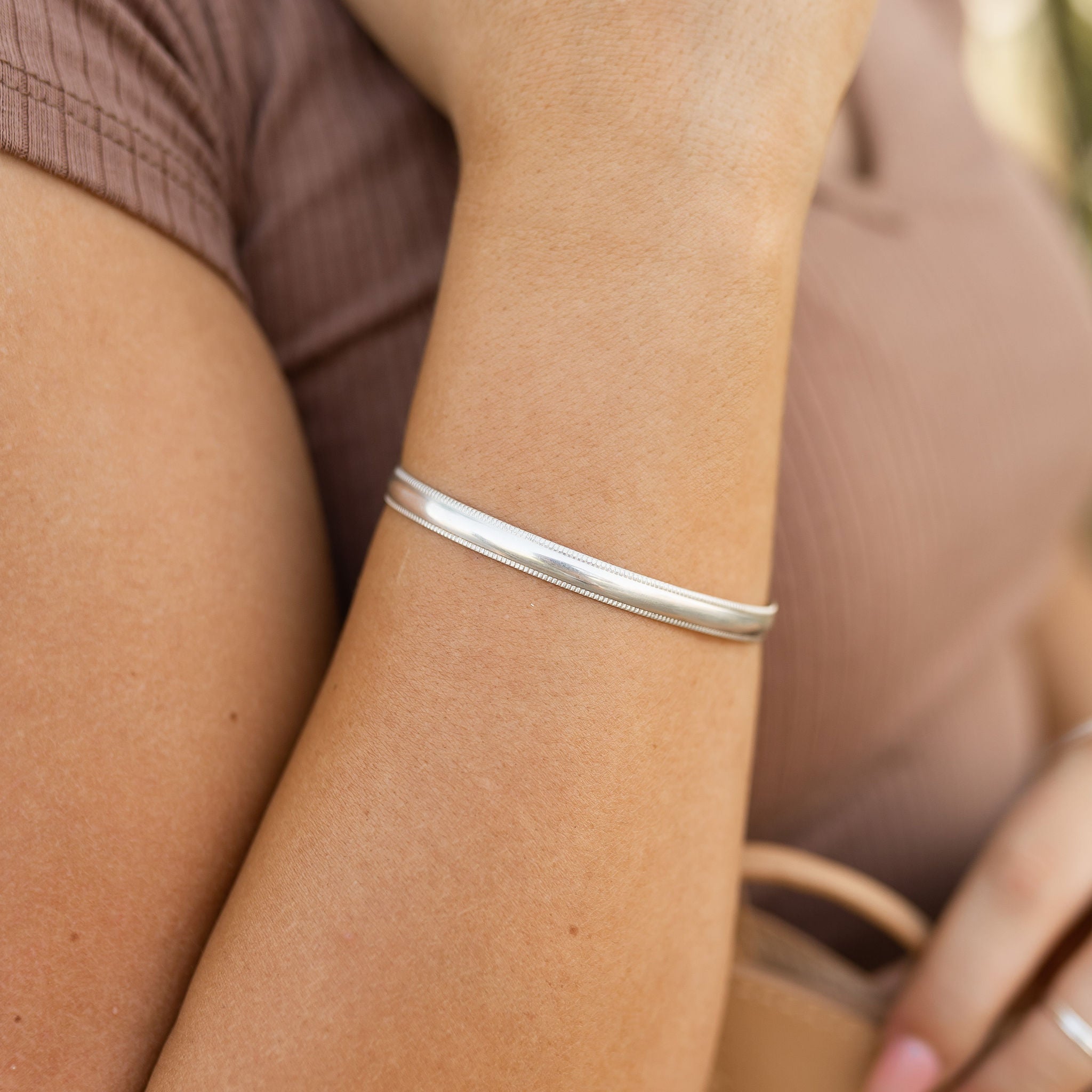 Perfect for layering with other cuffs and bracelets or wearing on its own. This cuff has detail on the edges.
