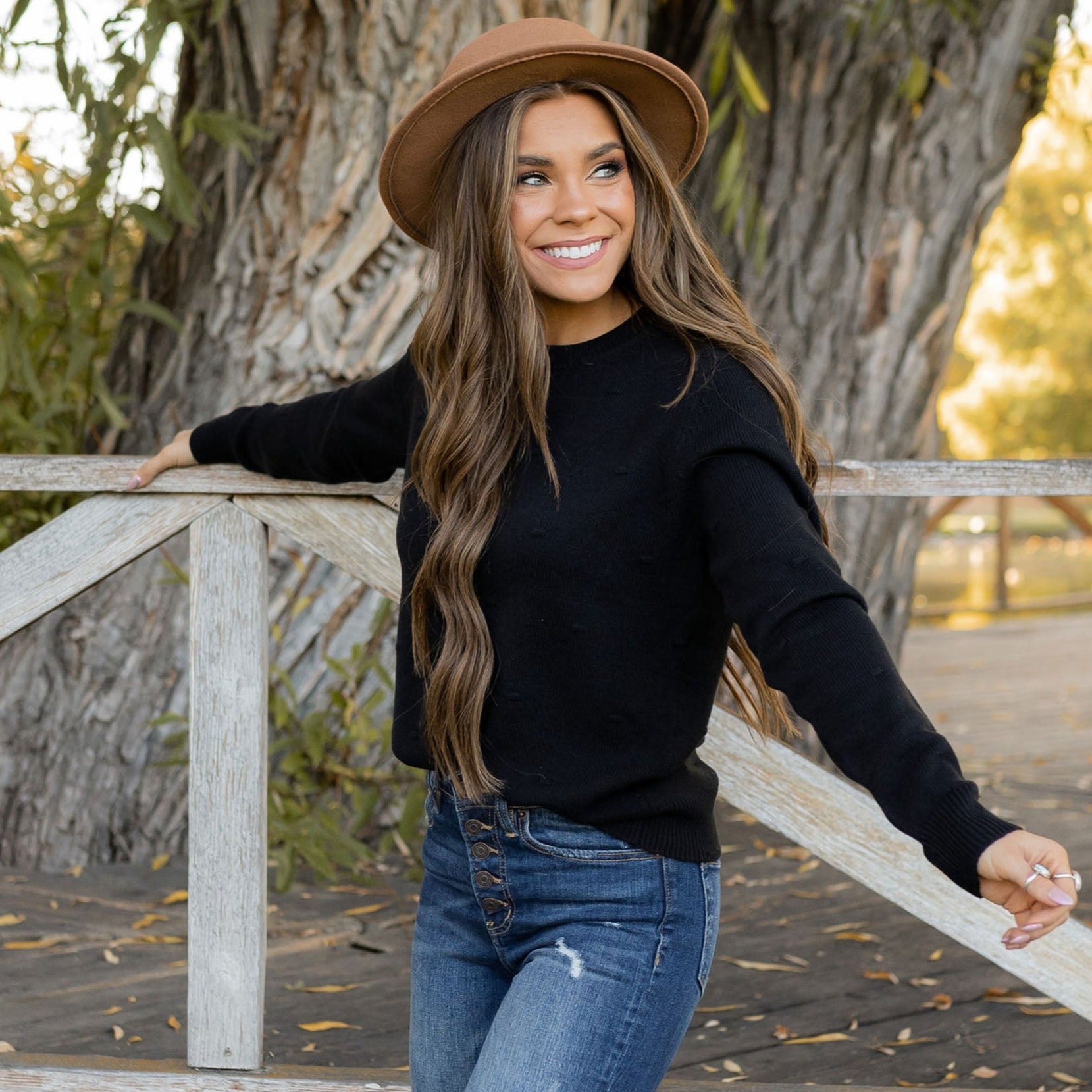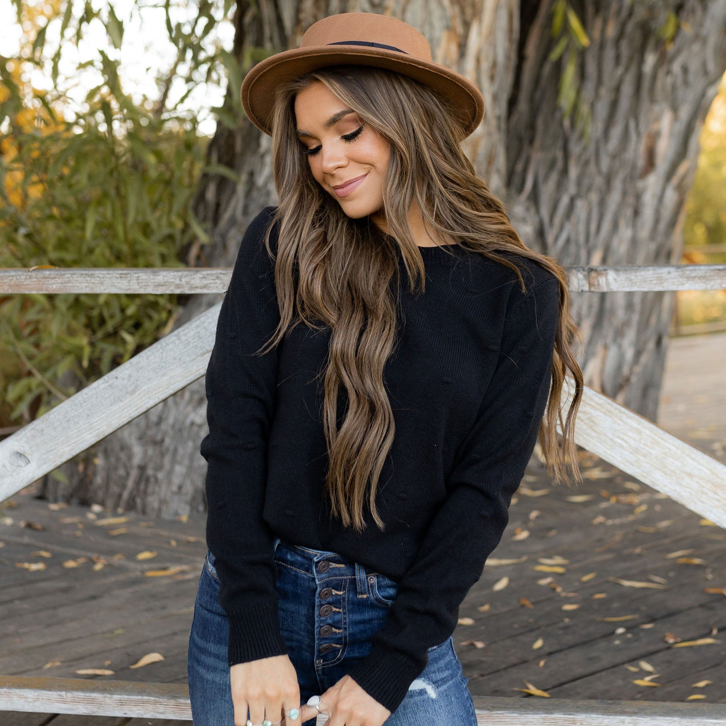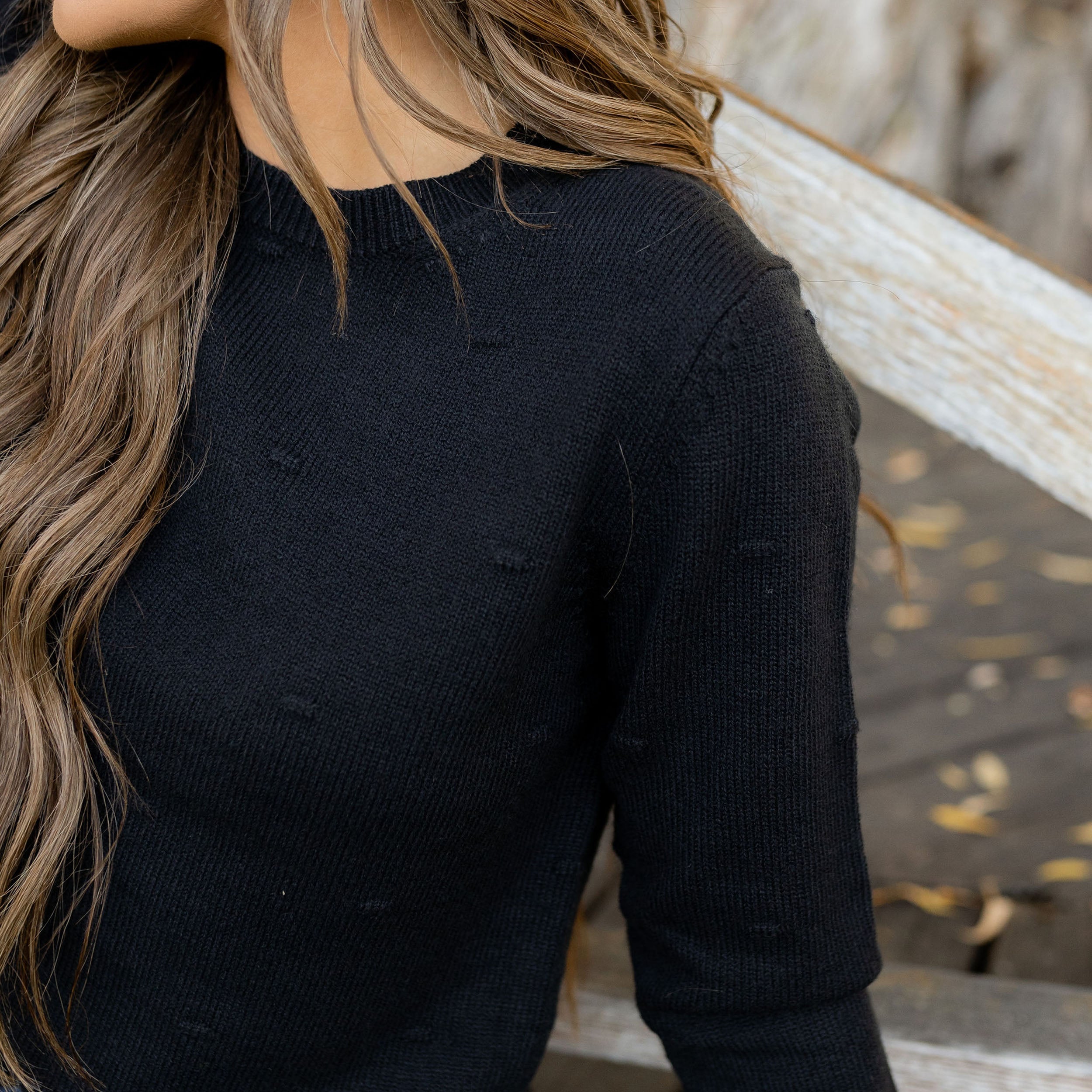 Our Emery Sweater has an adorable polka dot texture to add a little fun to your regular sweater! She looks perfect with your favorite pair of jeans and booties or paired with a skirt.