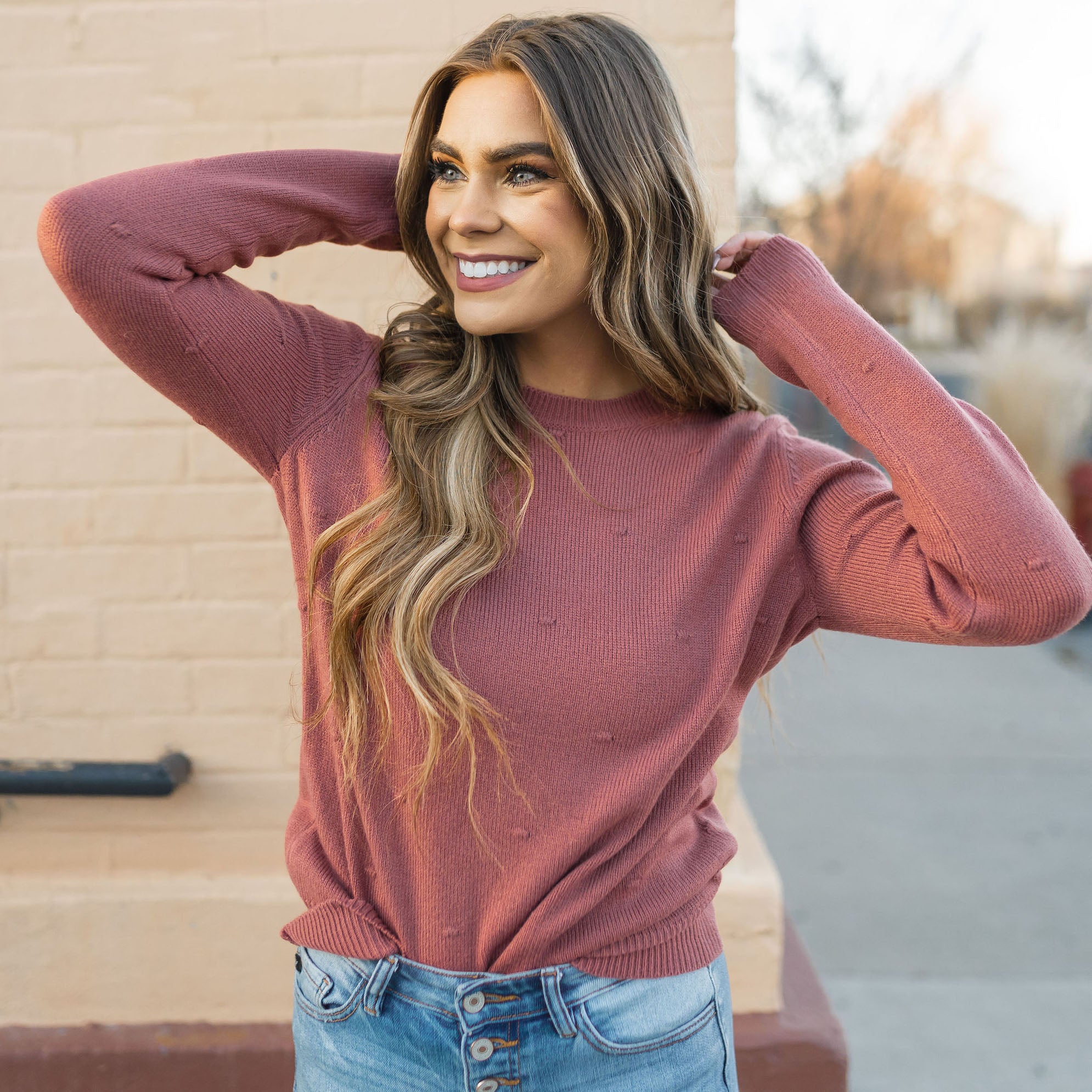Our Emery Sweater has an adorable polka dot texture to add a little fun to your regular sweater! She looks perfect with your favorite pair of jeans and booties or paired with a skirt.