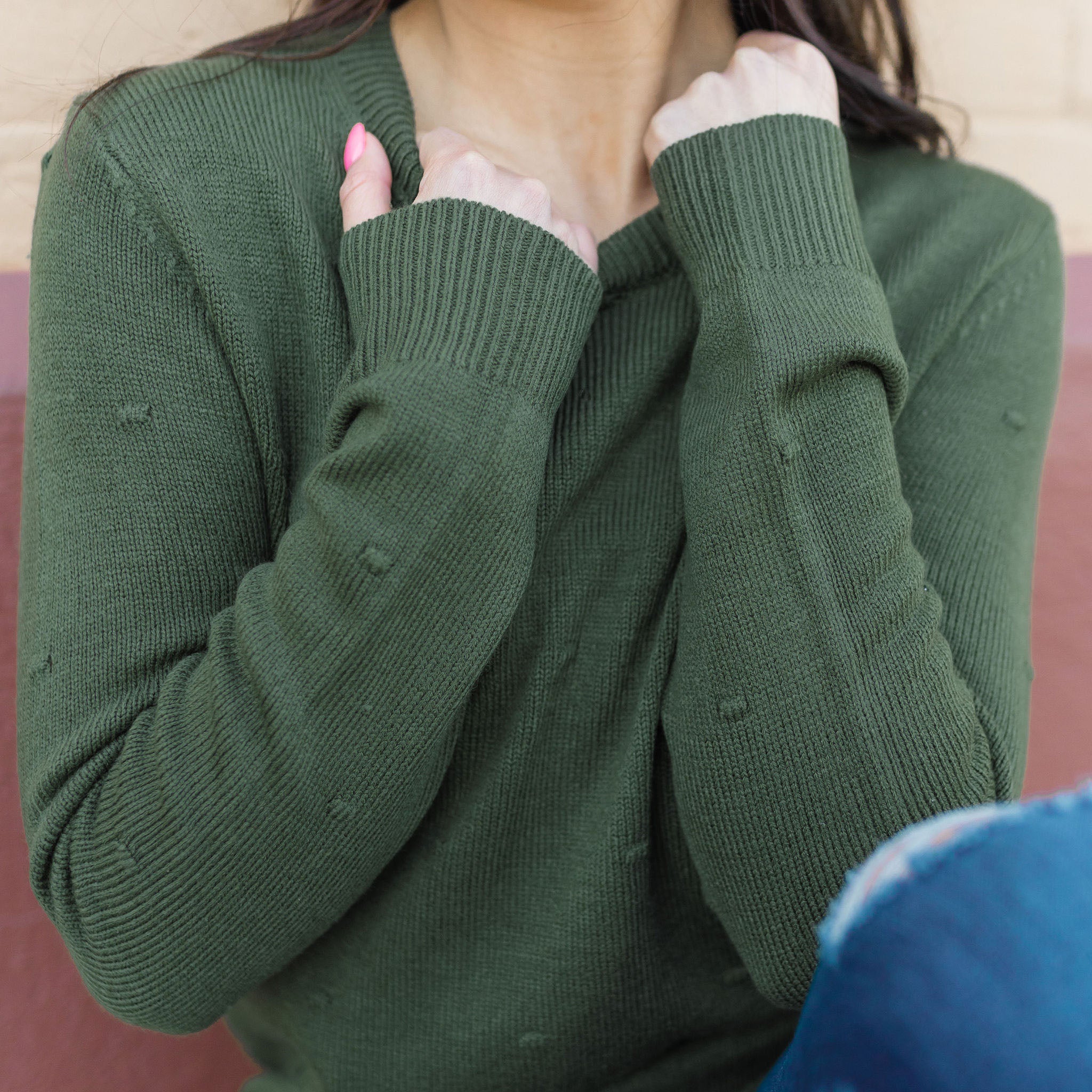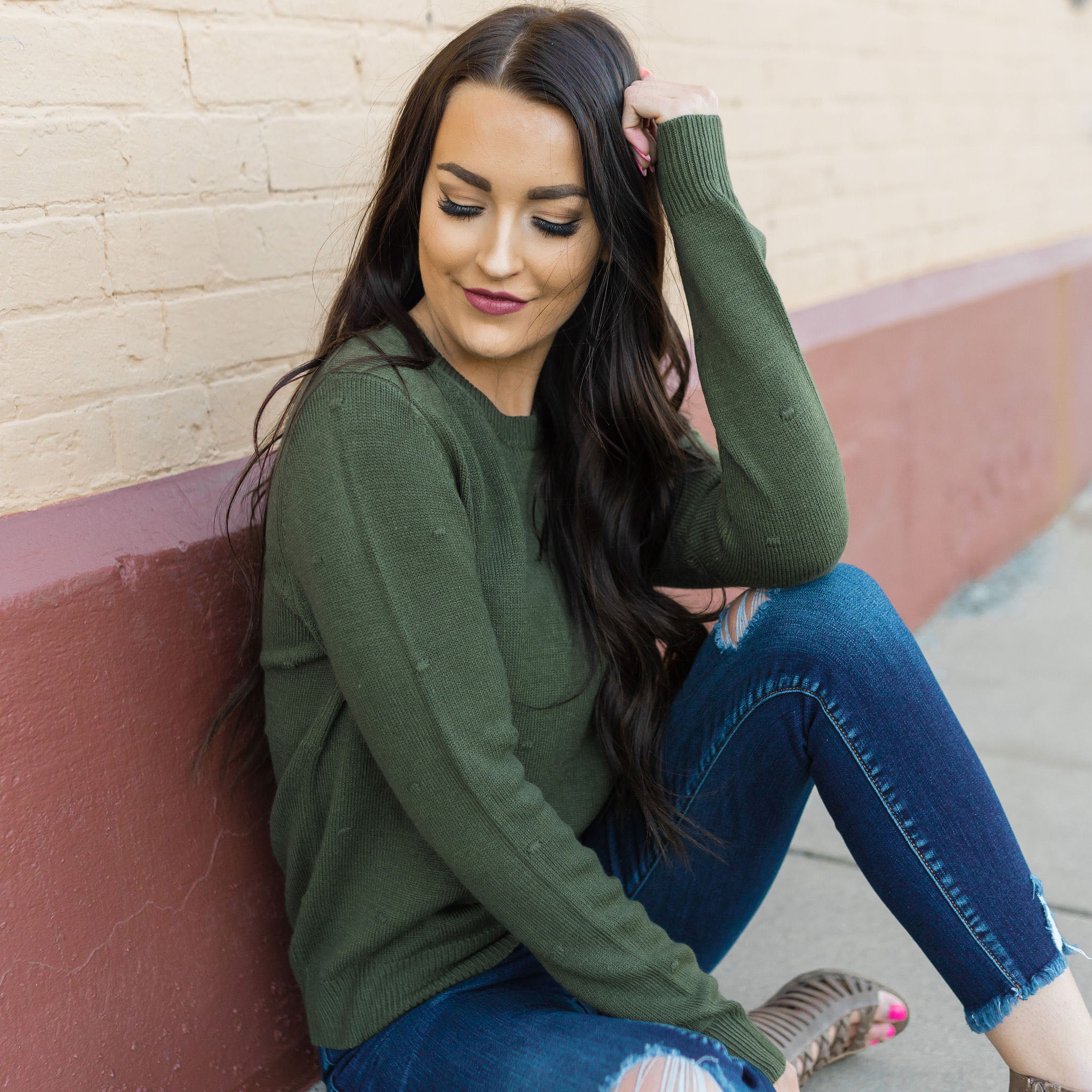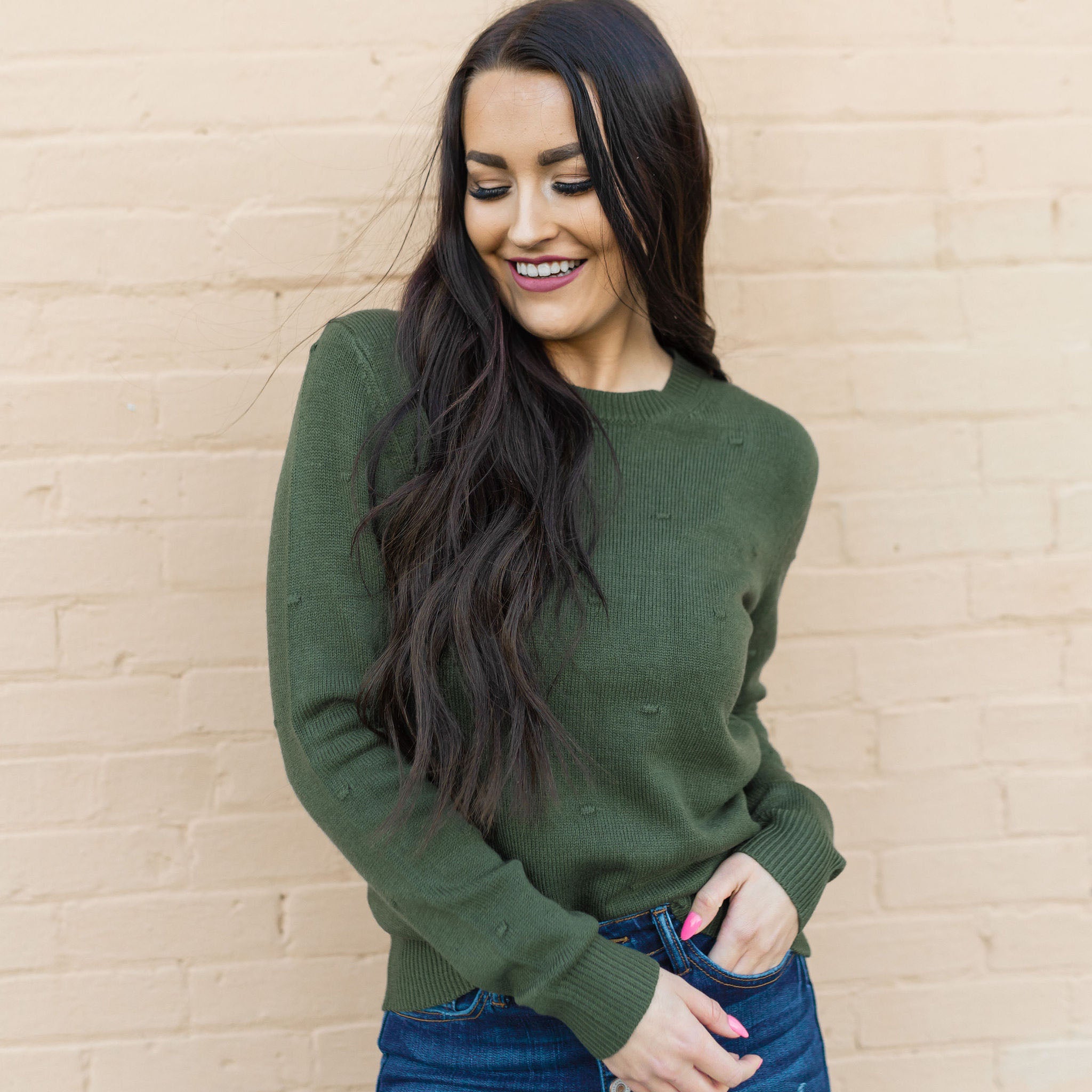 Our Emery Sweater has an adorable polka dot texture to add a little fun to your regular sweater! She looks perfect with your favorite pair of jeans and booties or paired with a skirt.