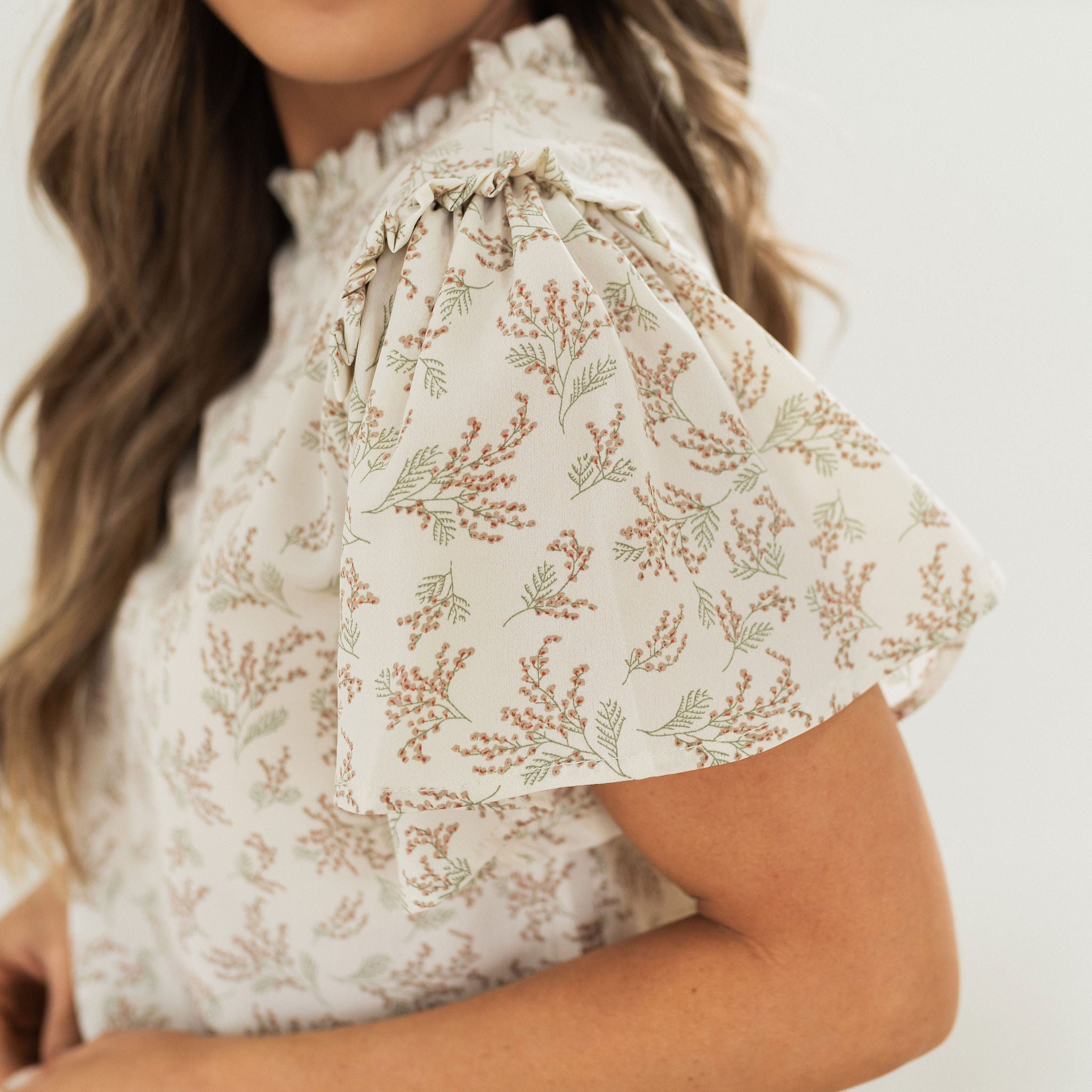 Our Gianna Blouse is such a beautiful piece! It has delicate fall florals on it that will dress up any outfit! The flowy sleeves and ruffled neckline add the perfect touch to this blouse!