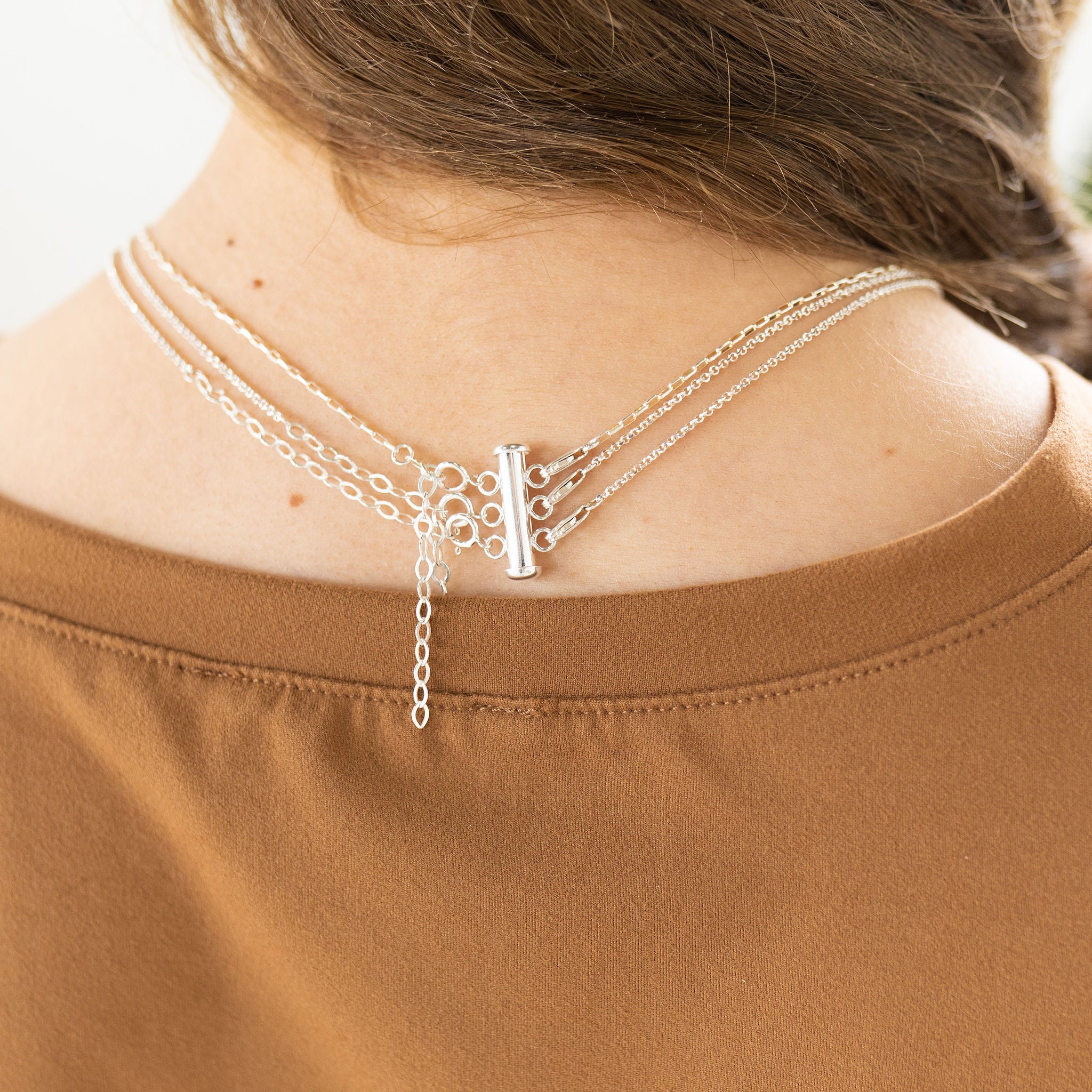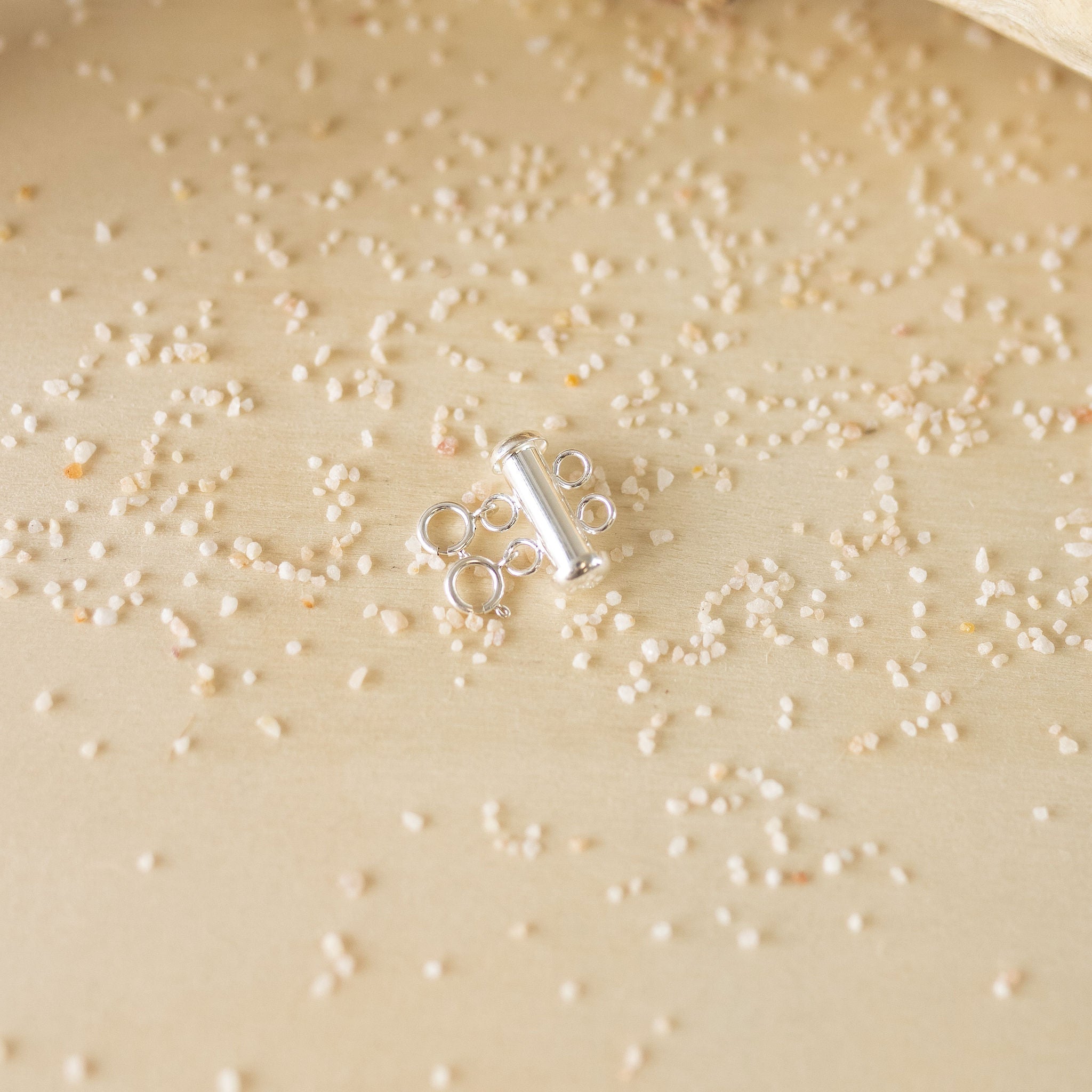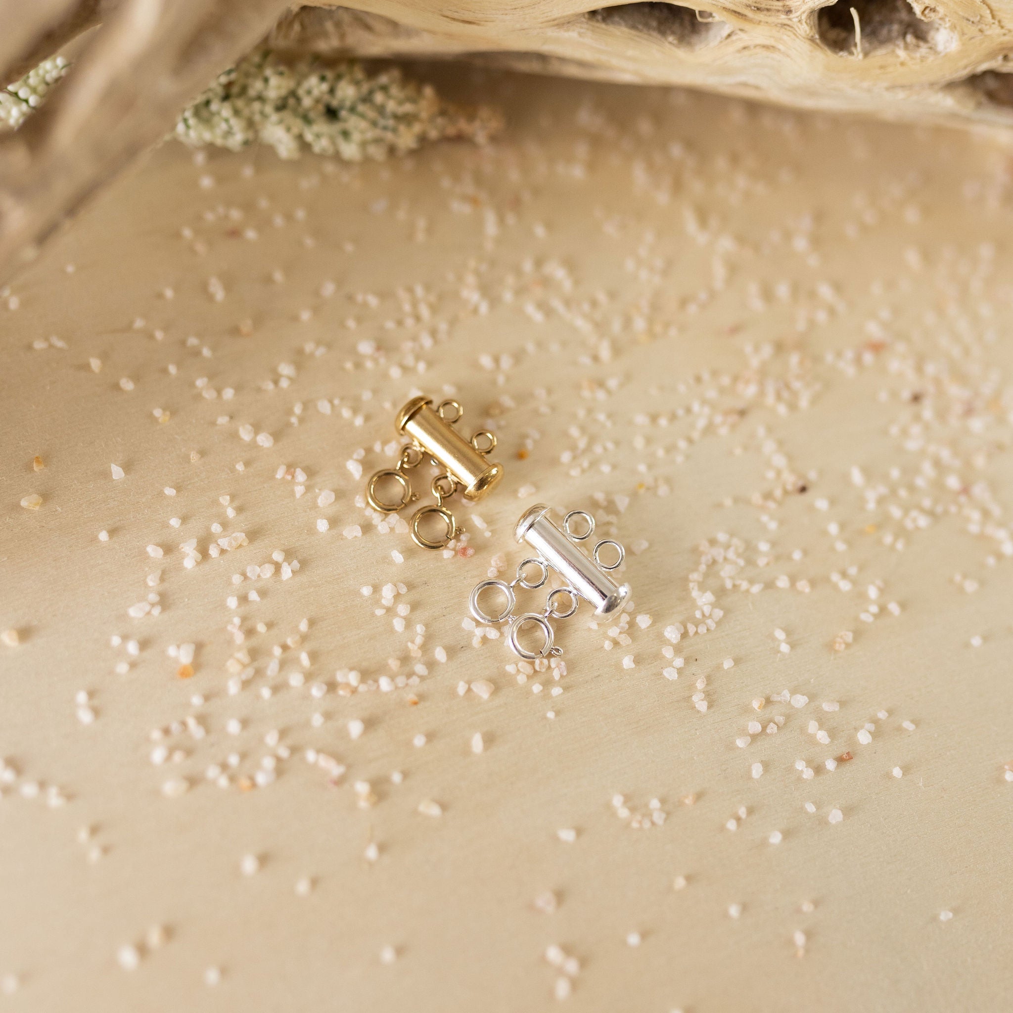 These tube slide clasp makes it easy to create layered looks and switch them up. One side features spring rings while the other features jump rings, spaced to show off chains and necklaces without tangling. The tube clasp offers a strong, secure closure.