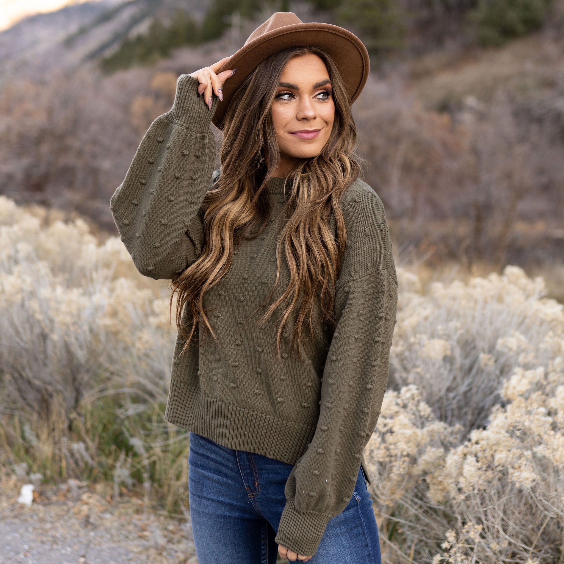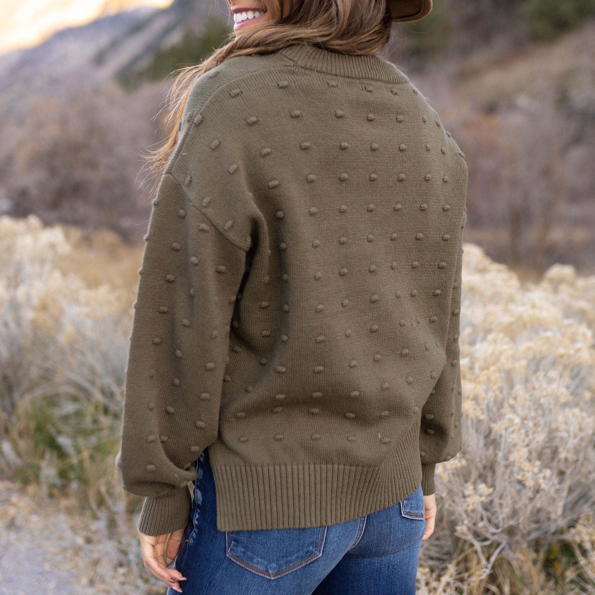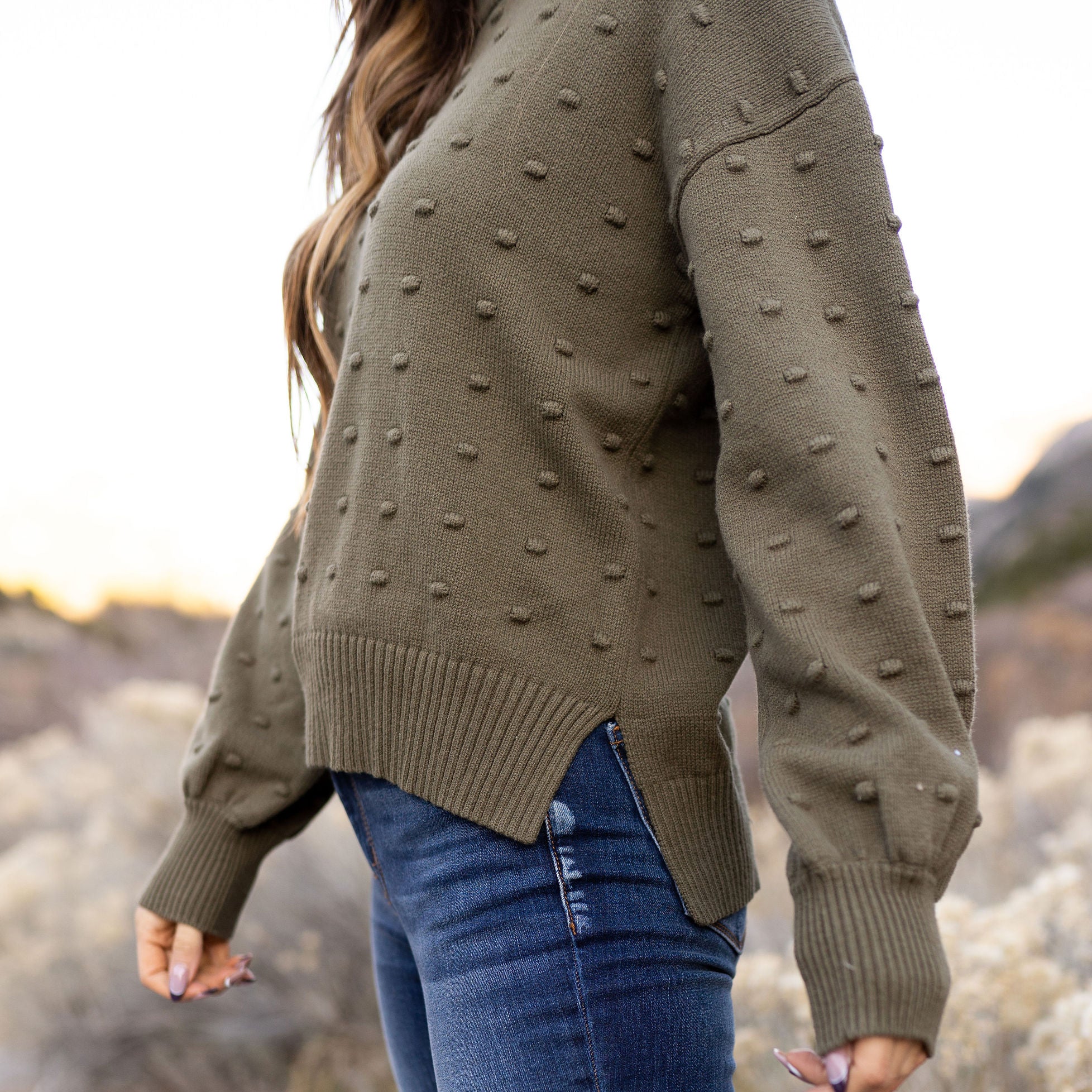 Comfort + Cuteness all in one perfect sweater! The fun polka dot print in this sweater will have you turning heads and the compliments will be flooding in! Perfect to pair with jeans and your favorite pair of booties for running errands or a night on the town!