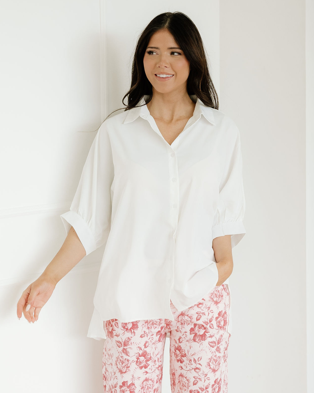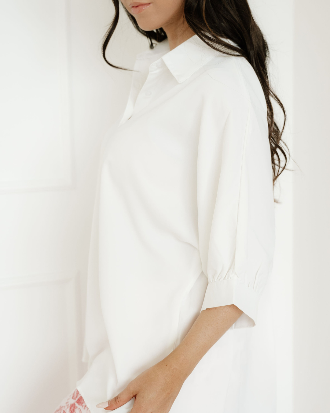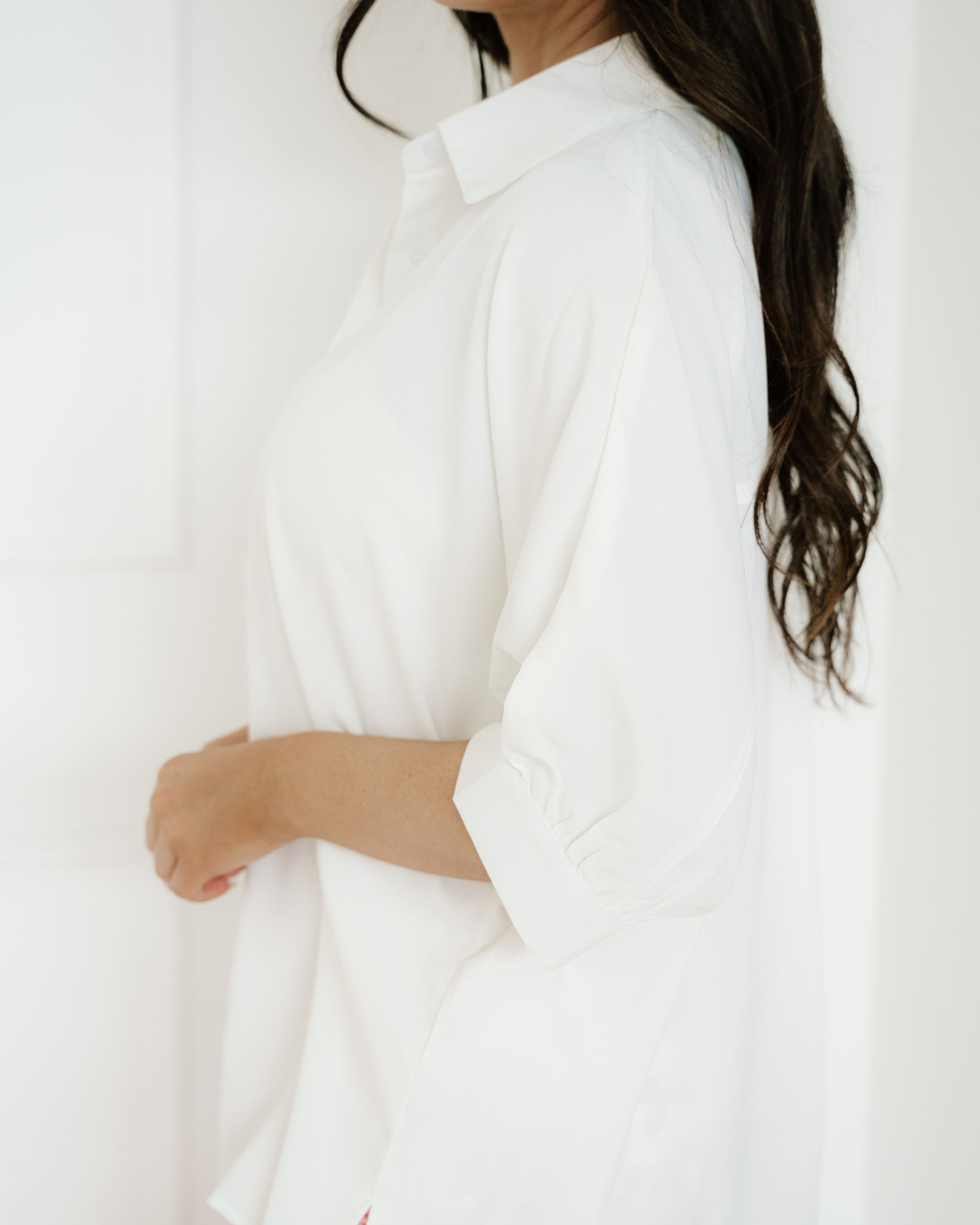 Wrenlee Plain 3/4 Batwing Sleeve Oversize Button Up Blouse - White