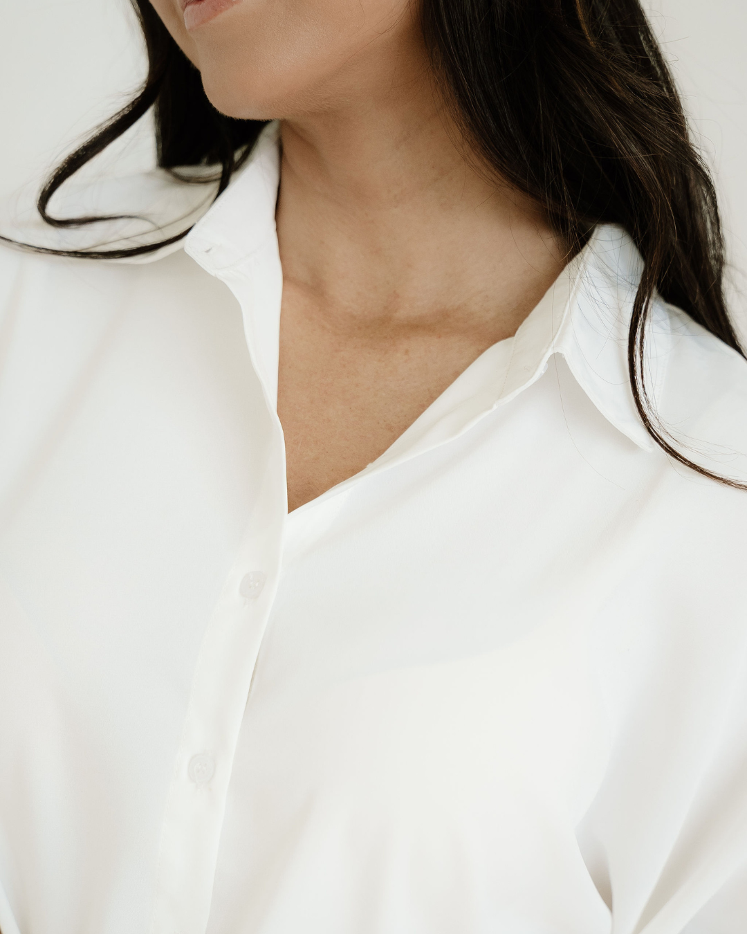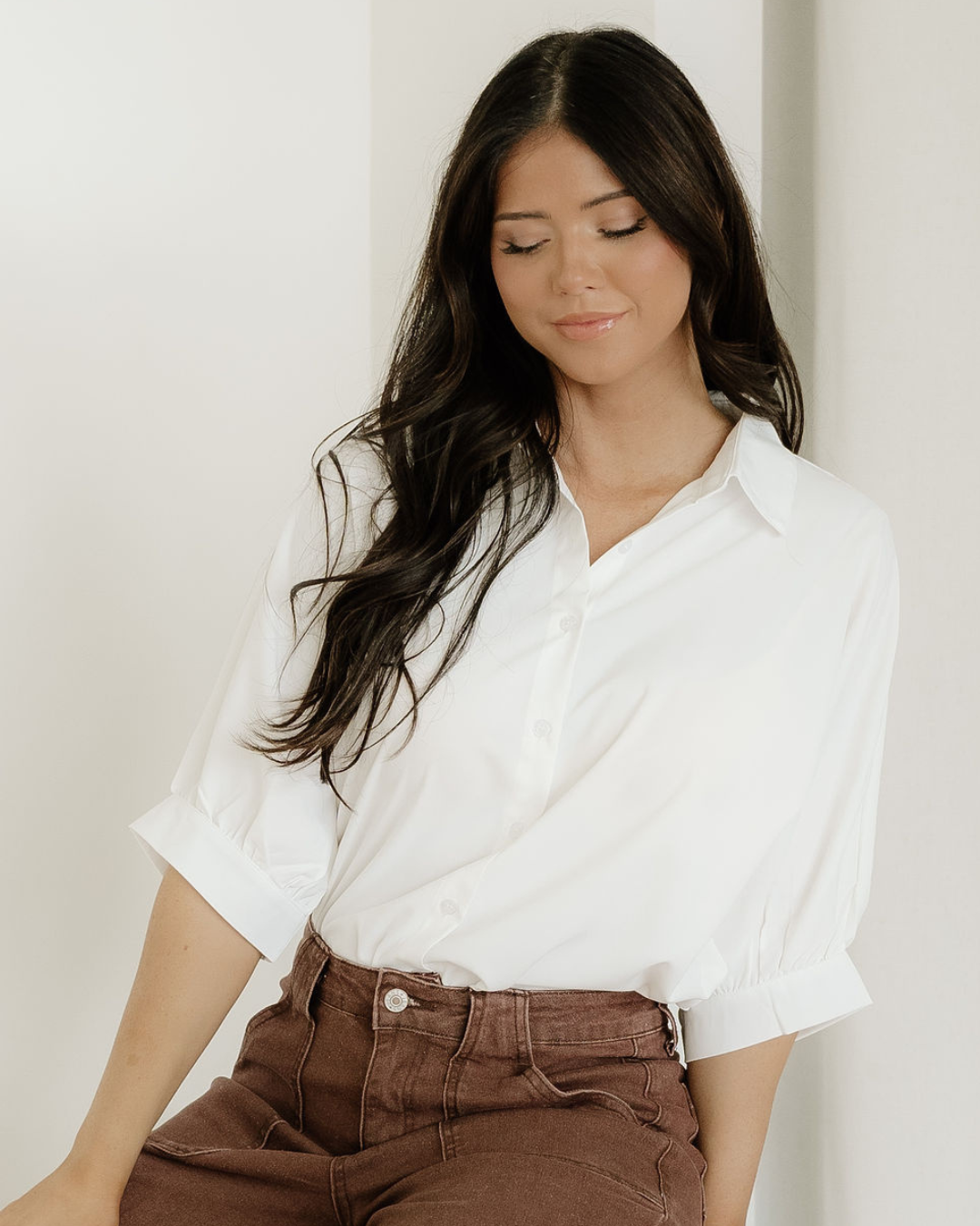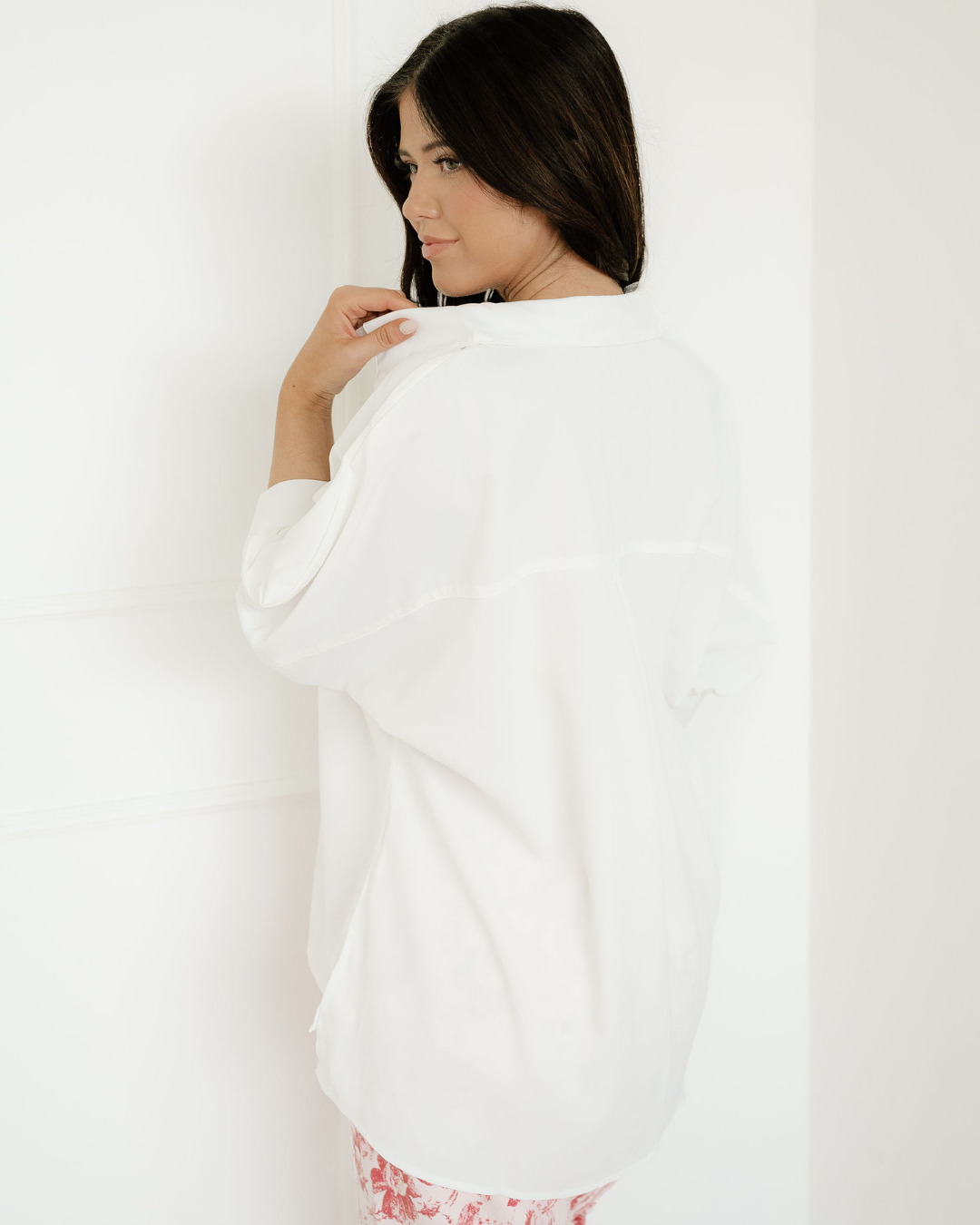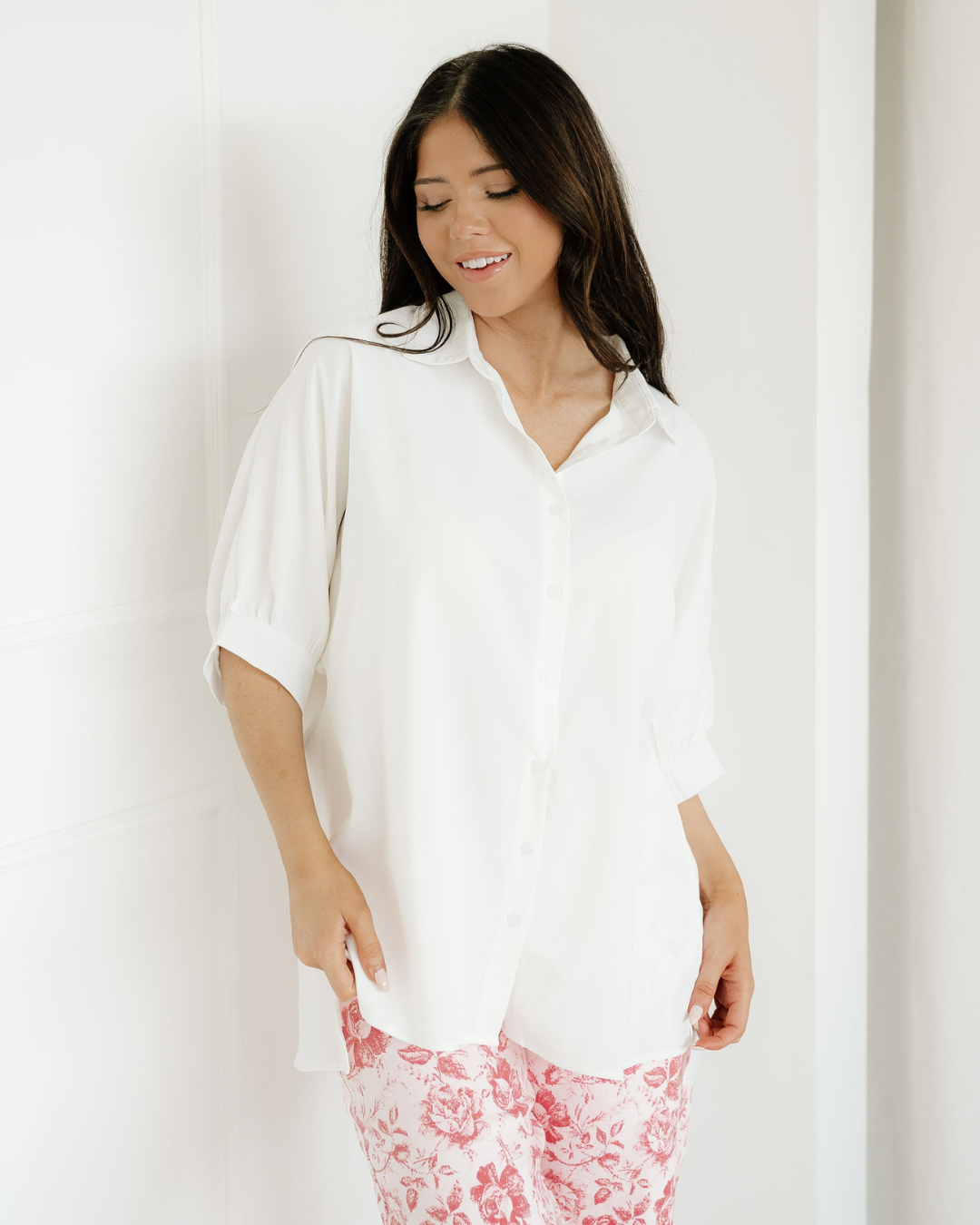 Wrenlee Plain 3/4 Batwing Sleeve Oversize Button Up Blouse - White