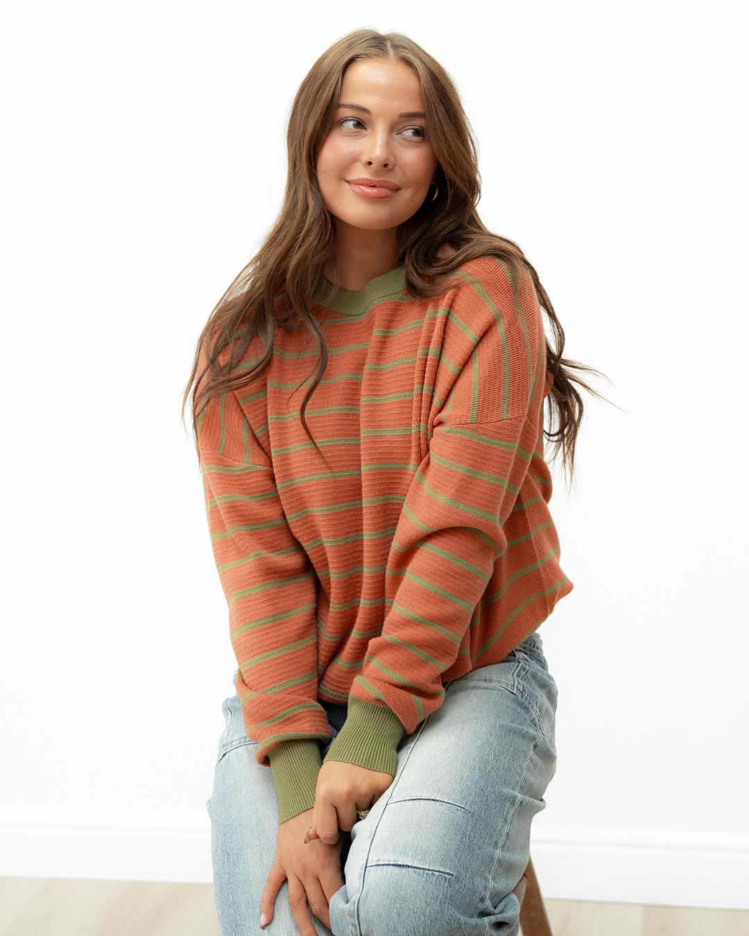 Avery Striped Ribbed Trim Drop Shoulder Sweater | Dropship