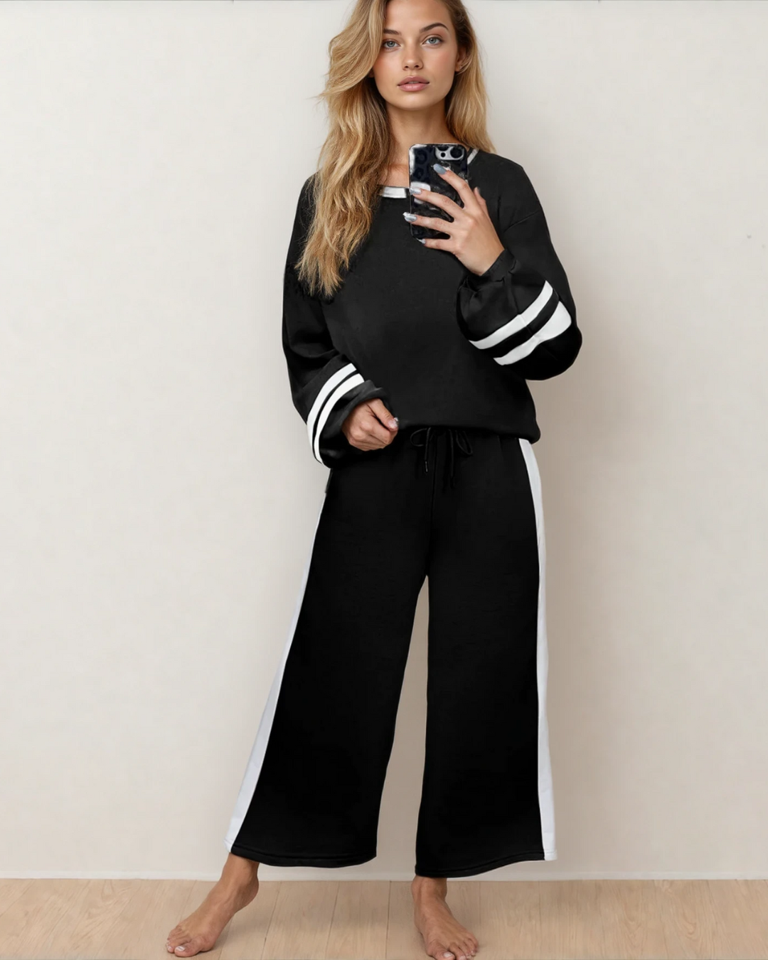 Jordyn Varsity Stripe Drawstring Wide Leg Pant Set - Black | Dropship