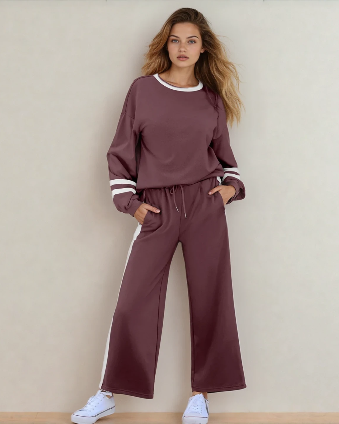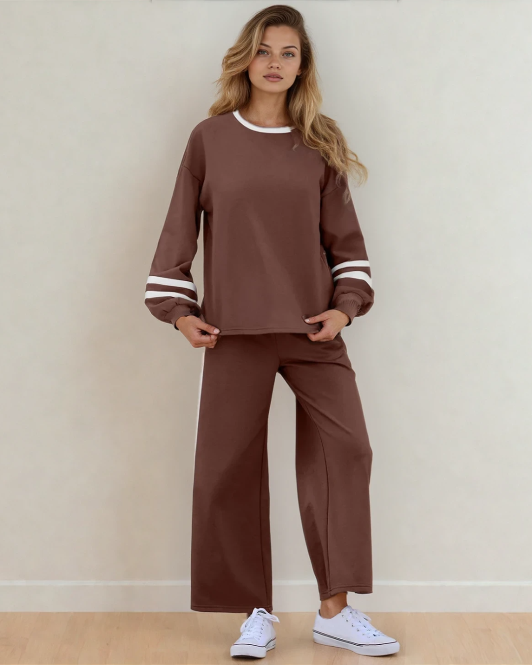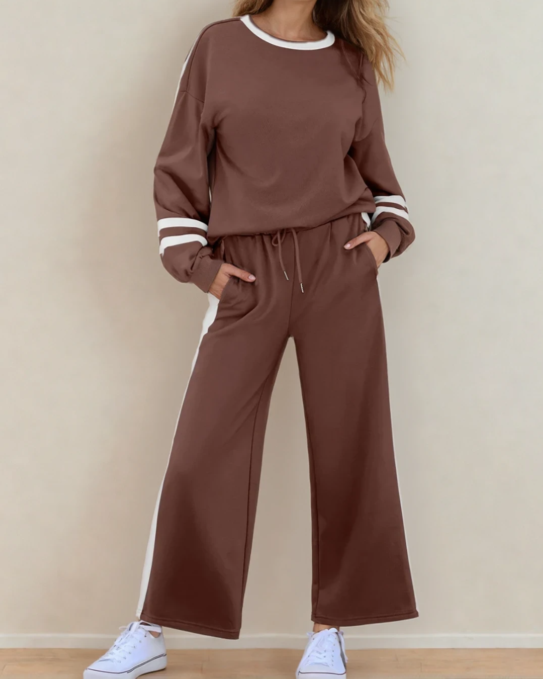 Jordyn Varsity Stripe Drawstring Wide Leg Pant Set - Chestnut | Dropship