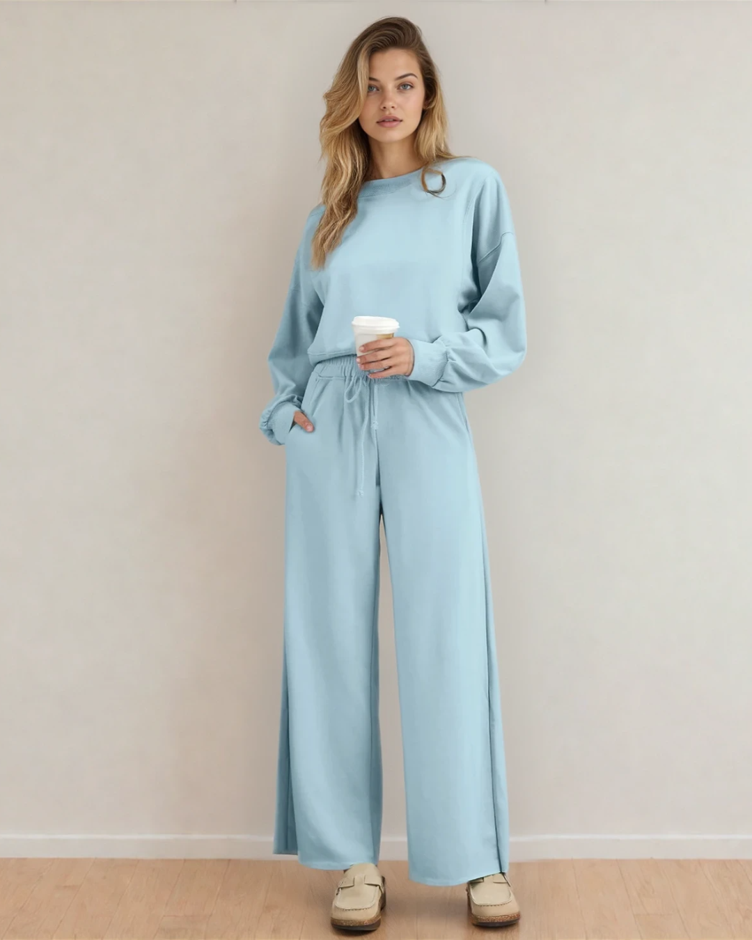 Miles Crop Pullover Drawstring Wide Leg Pants Set - Blue | Dropship